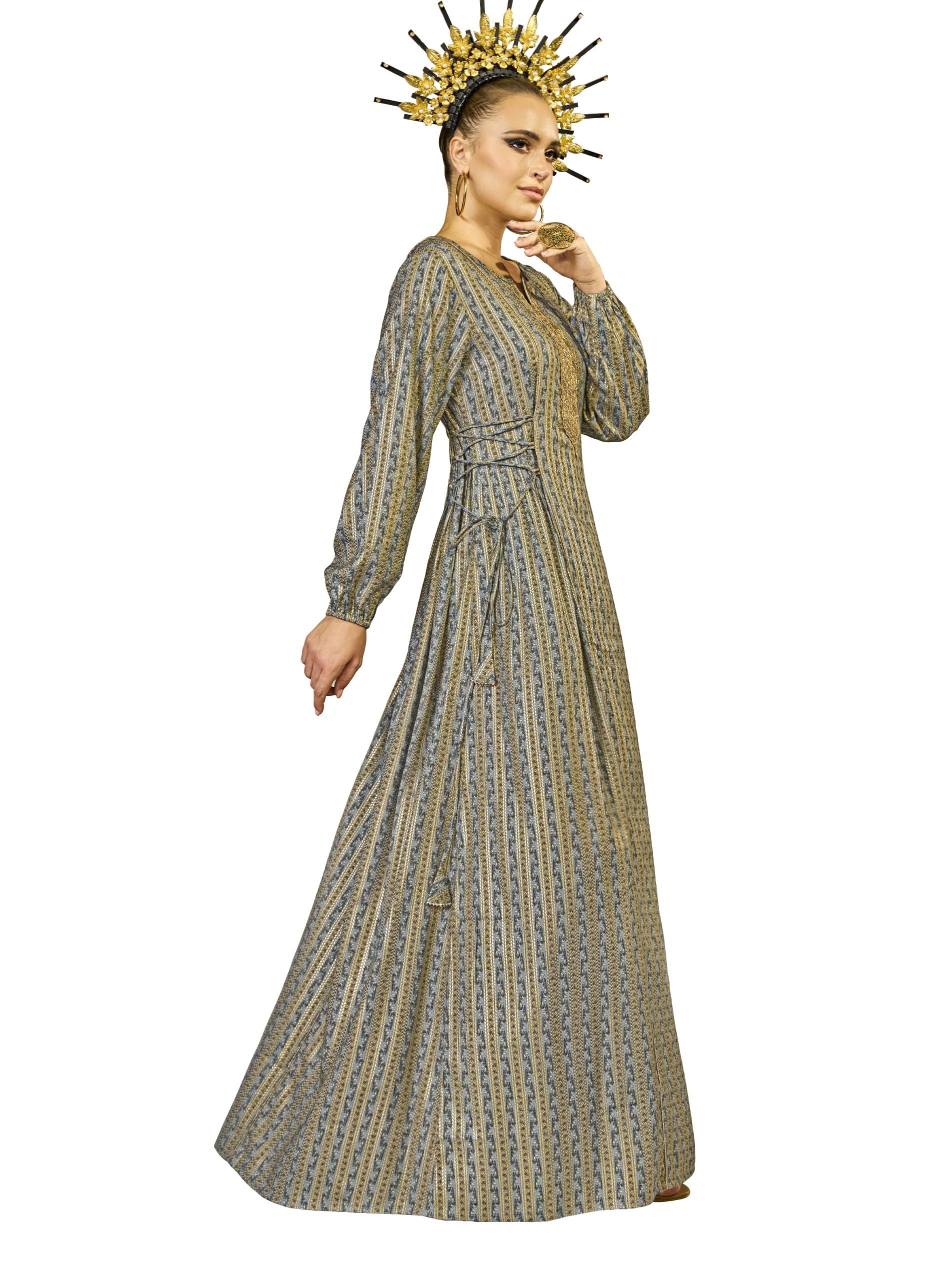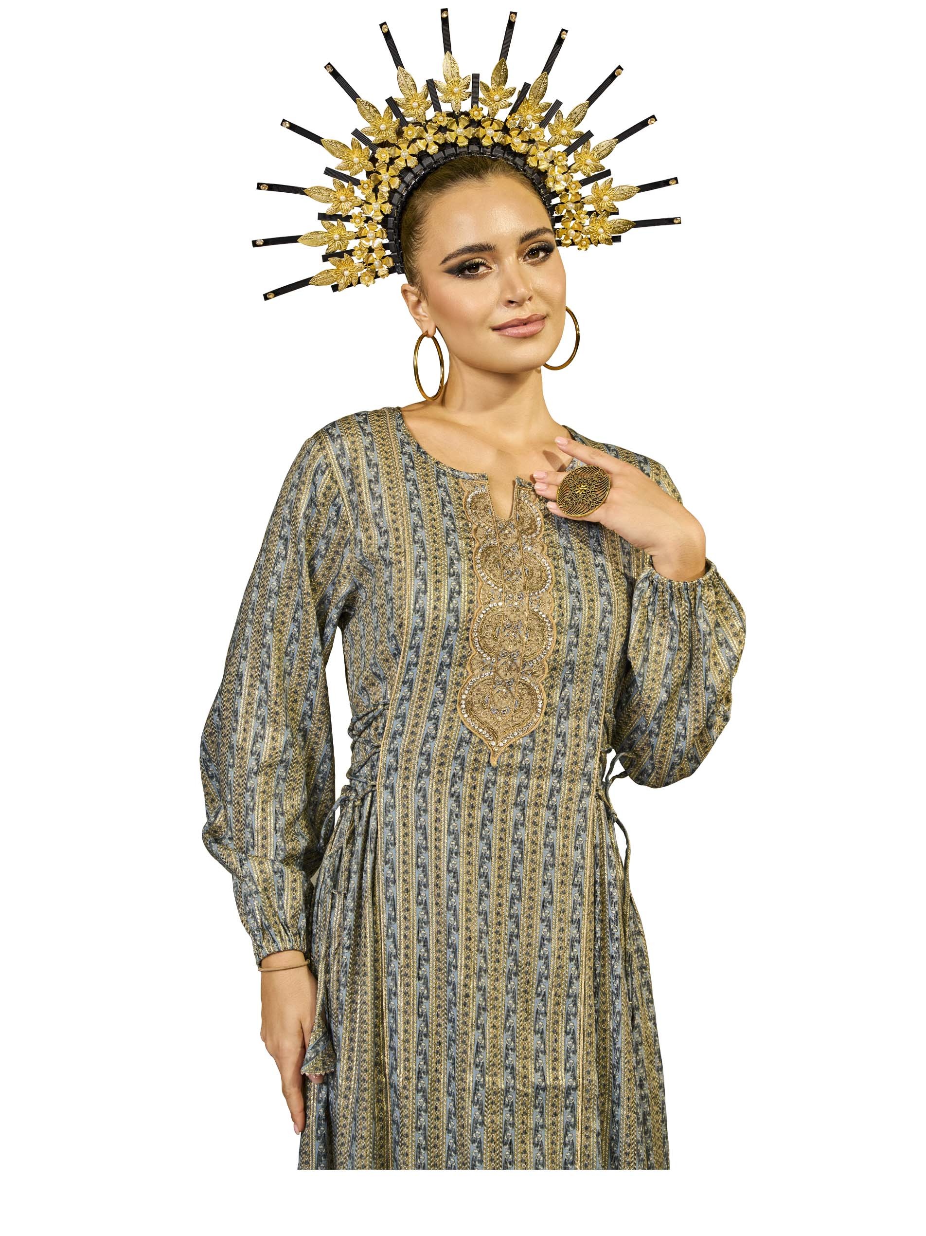 This soft and comfortable printed jalabiya features striking blue and yellow striped patterns that flow gracefully across the fabric. The neckline is adorned with delicate embroidery, adding a touch of visual interest, while the adjustable waist drawstring ensures a perfect fit. Crafted from breathable cotton, it is an ideal choice for Ramadan celebrations during the warm summer weather.