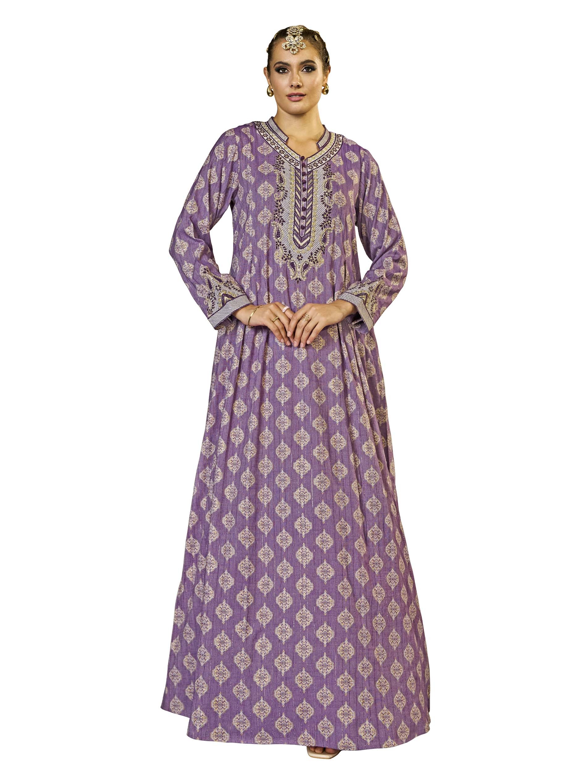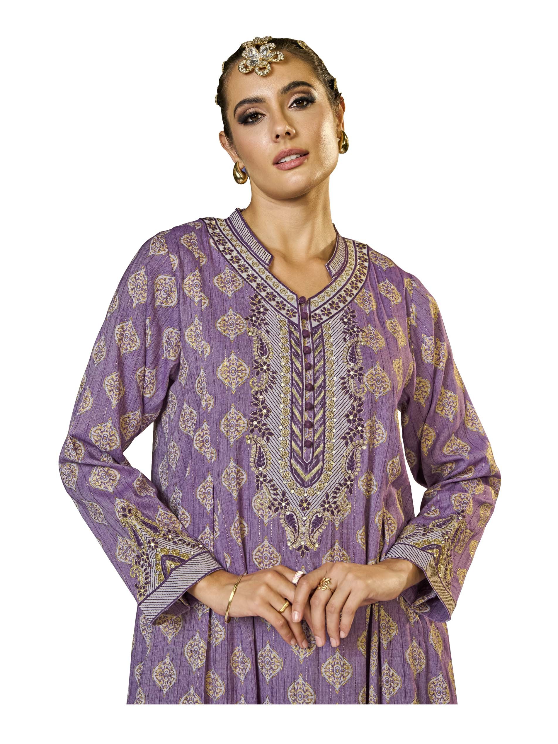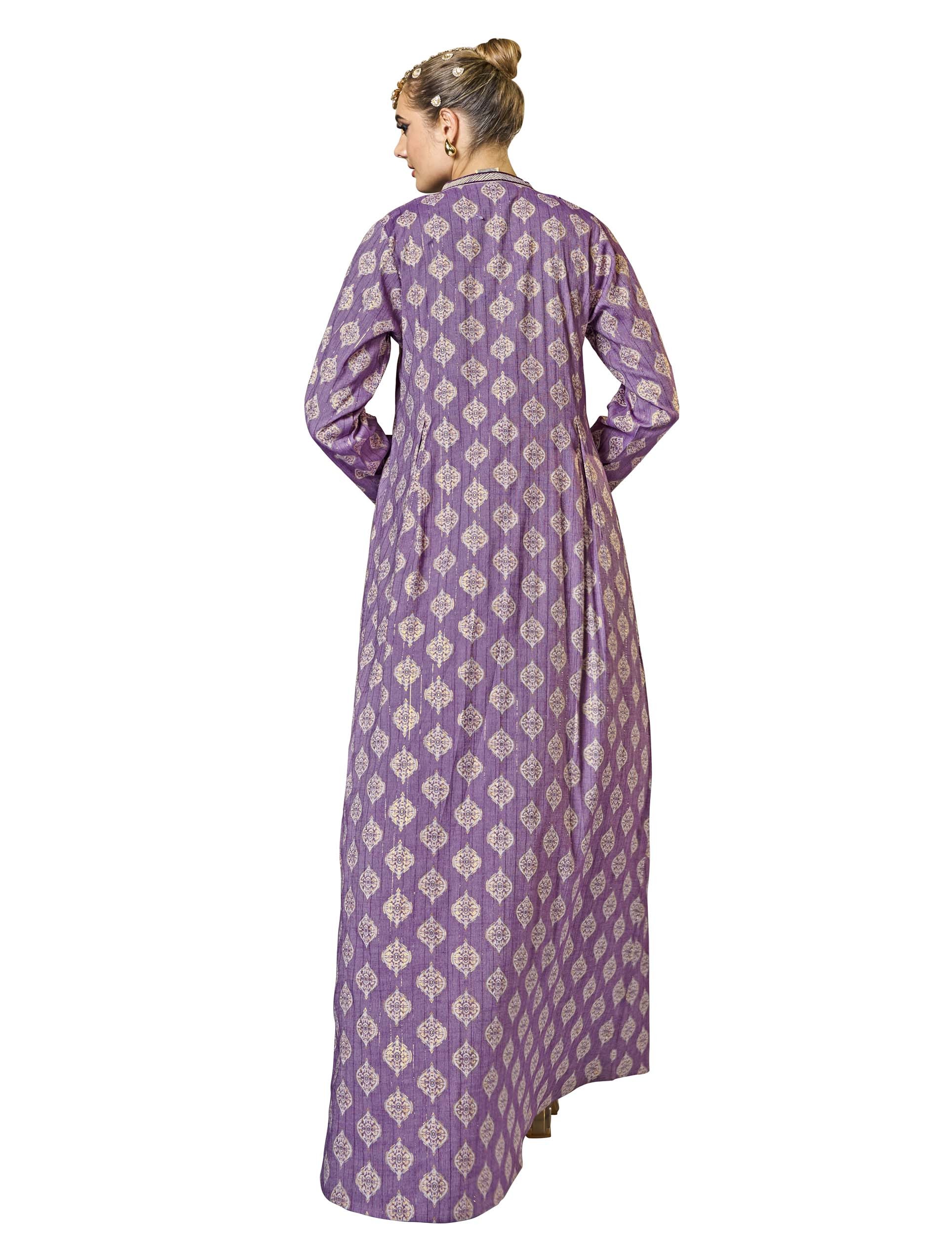 This A-line viscose jalabiya features a gorgeous damask lurex print in a rich purple hue, complemented by delicate embroidery and button detailing. The soft fabric and flowing silhouette make it perfect for warm summer days, especially during Ramadan. The elegant design combines style and comfort, making it an ideal choice for the season.