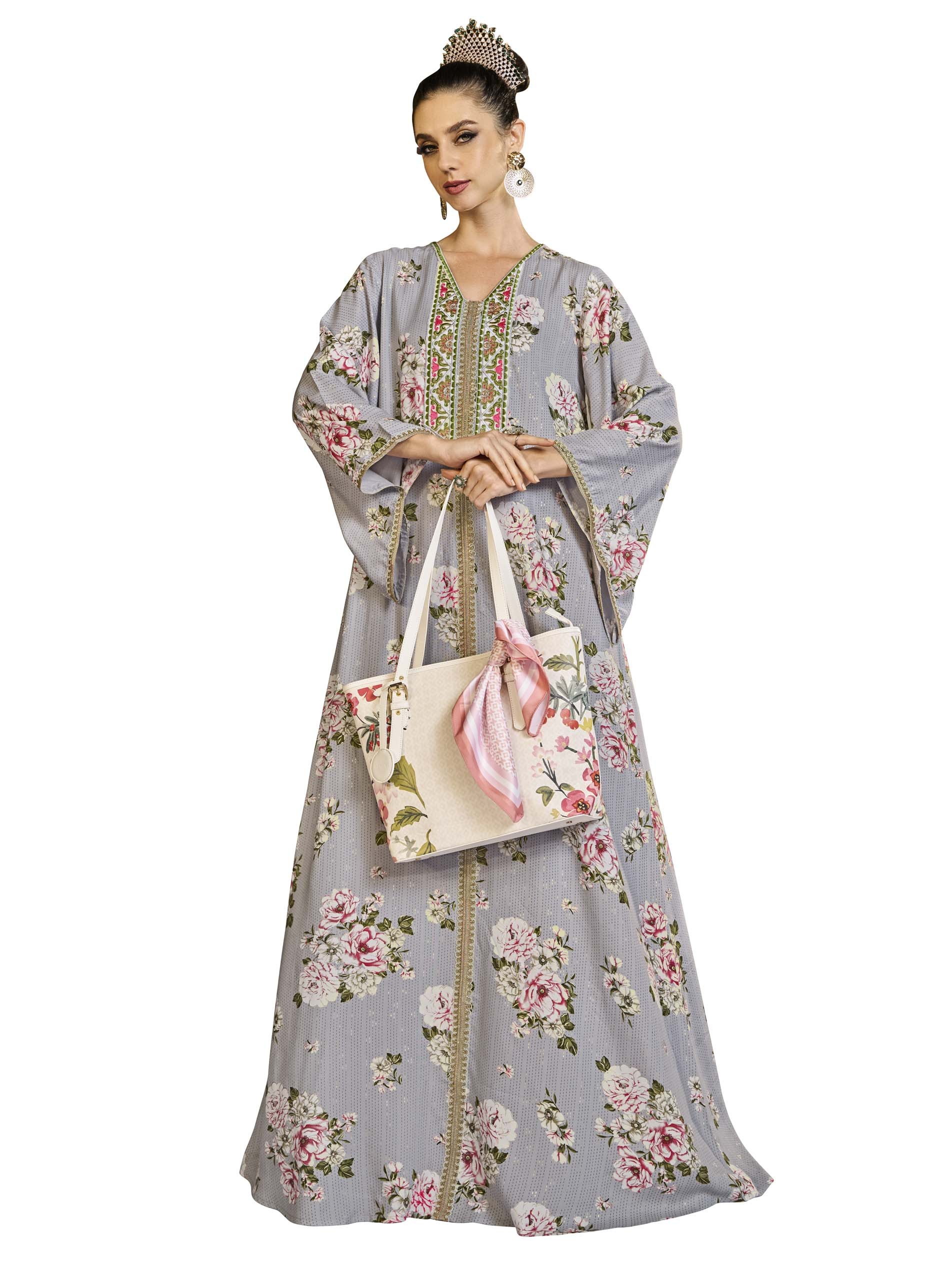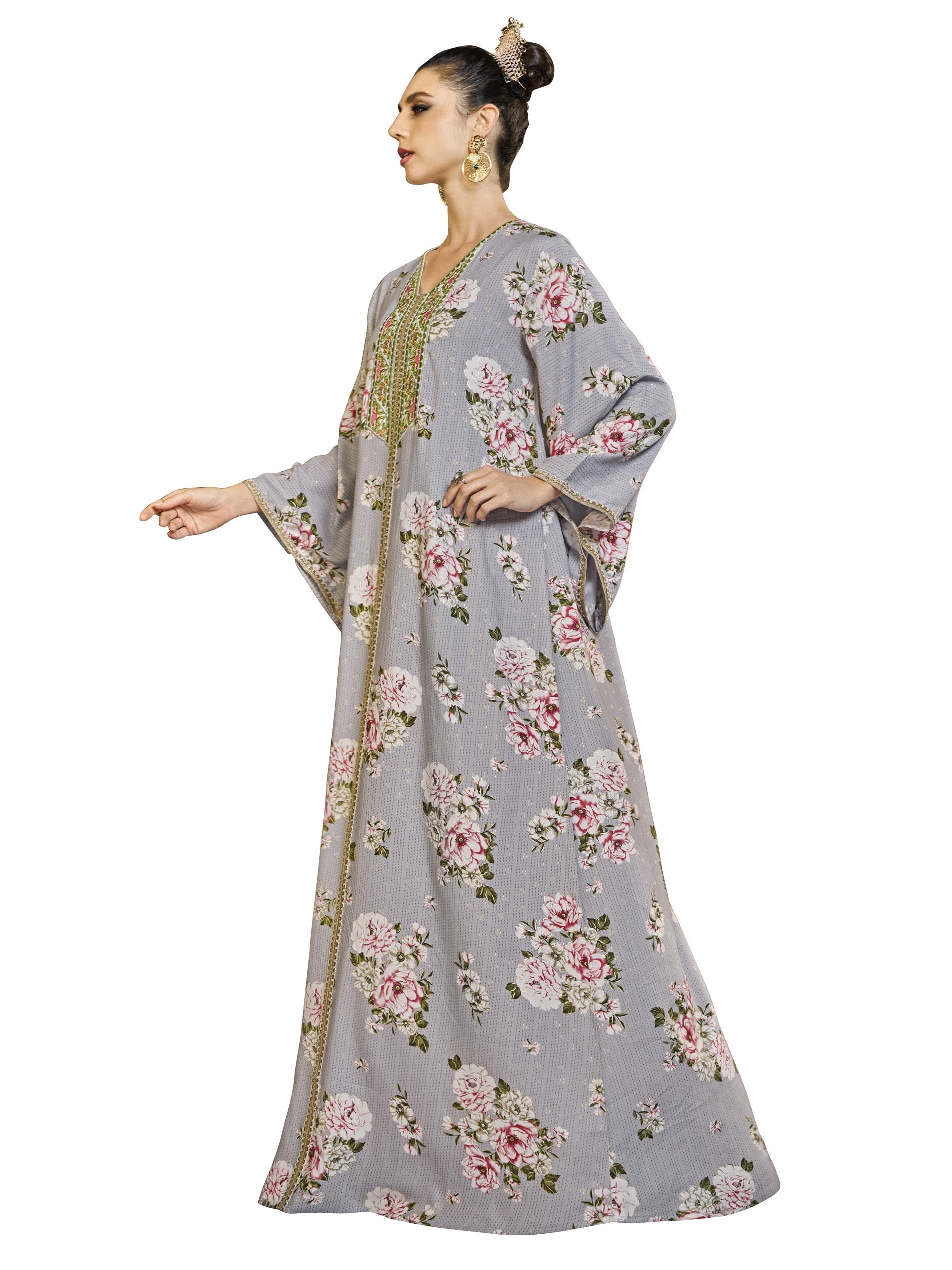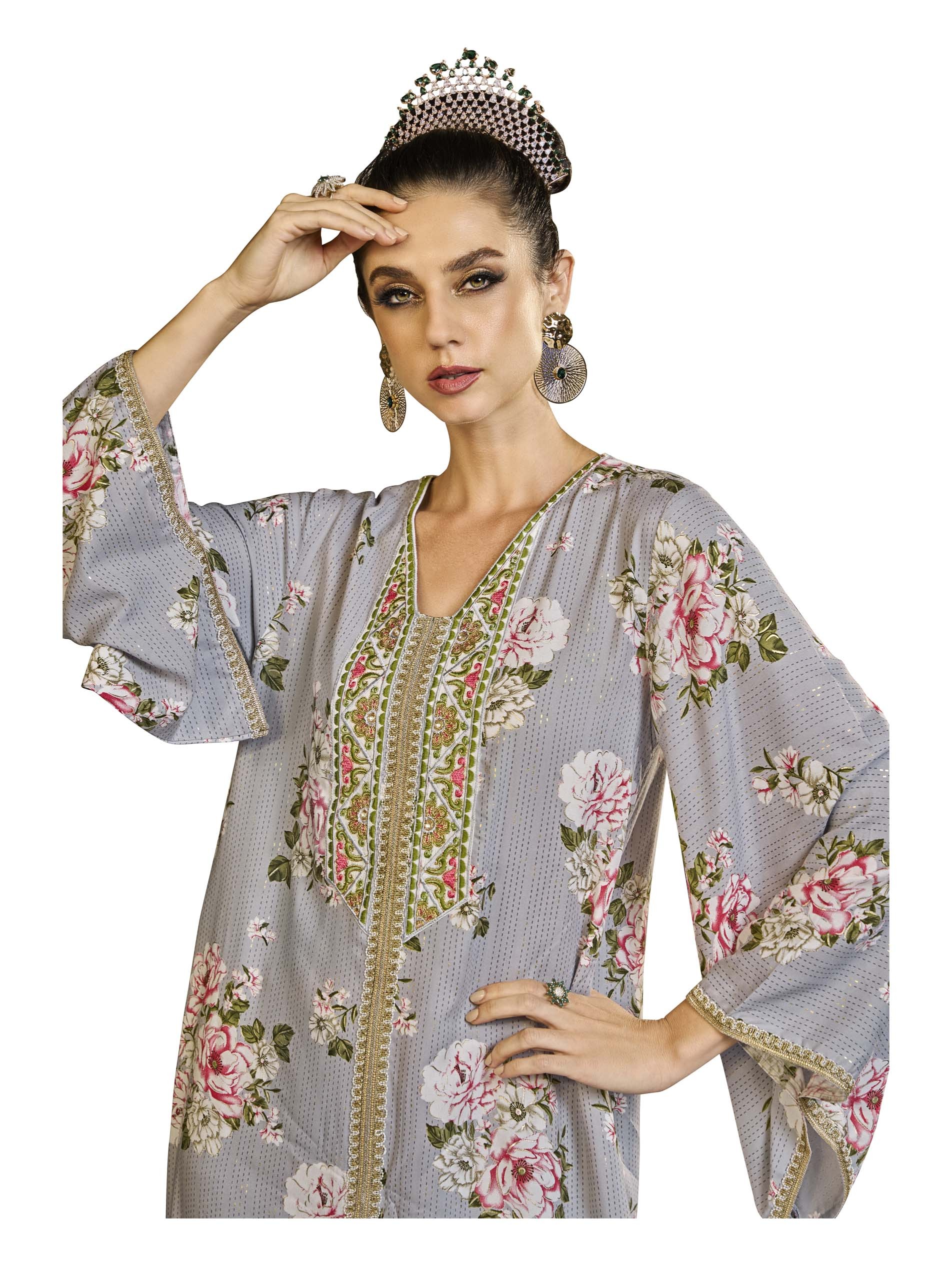 This beautiful rayon printed jalabiya features a soft grey hue with a vibrant floral print in pink, yellow, white, and green. The V-neckline with a vertical green design, paired with bell sleeves, adds a festive touch, perfect for Ramadan. Crafted from breathable cotton, it ensures comfort and style for summer wear.