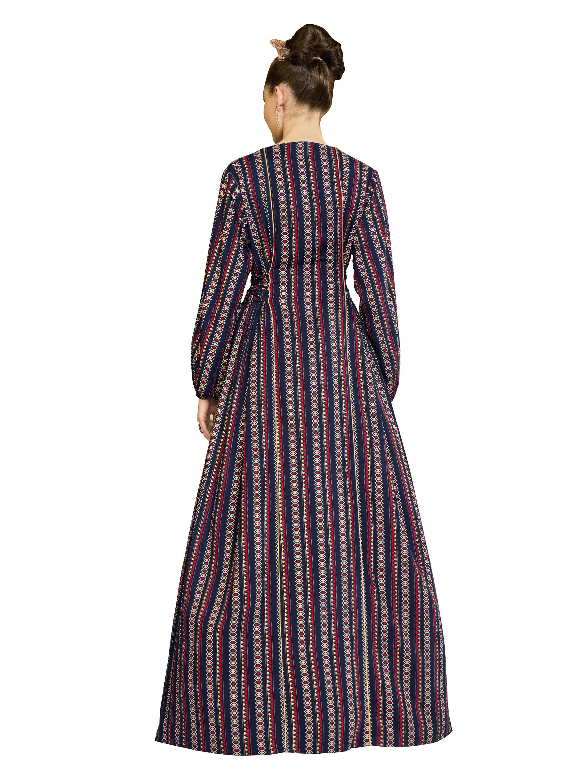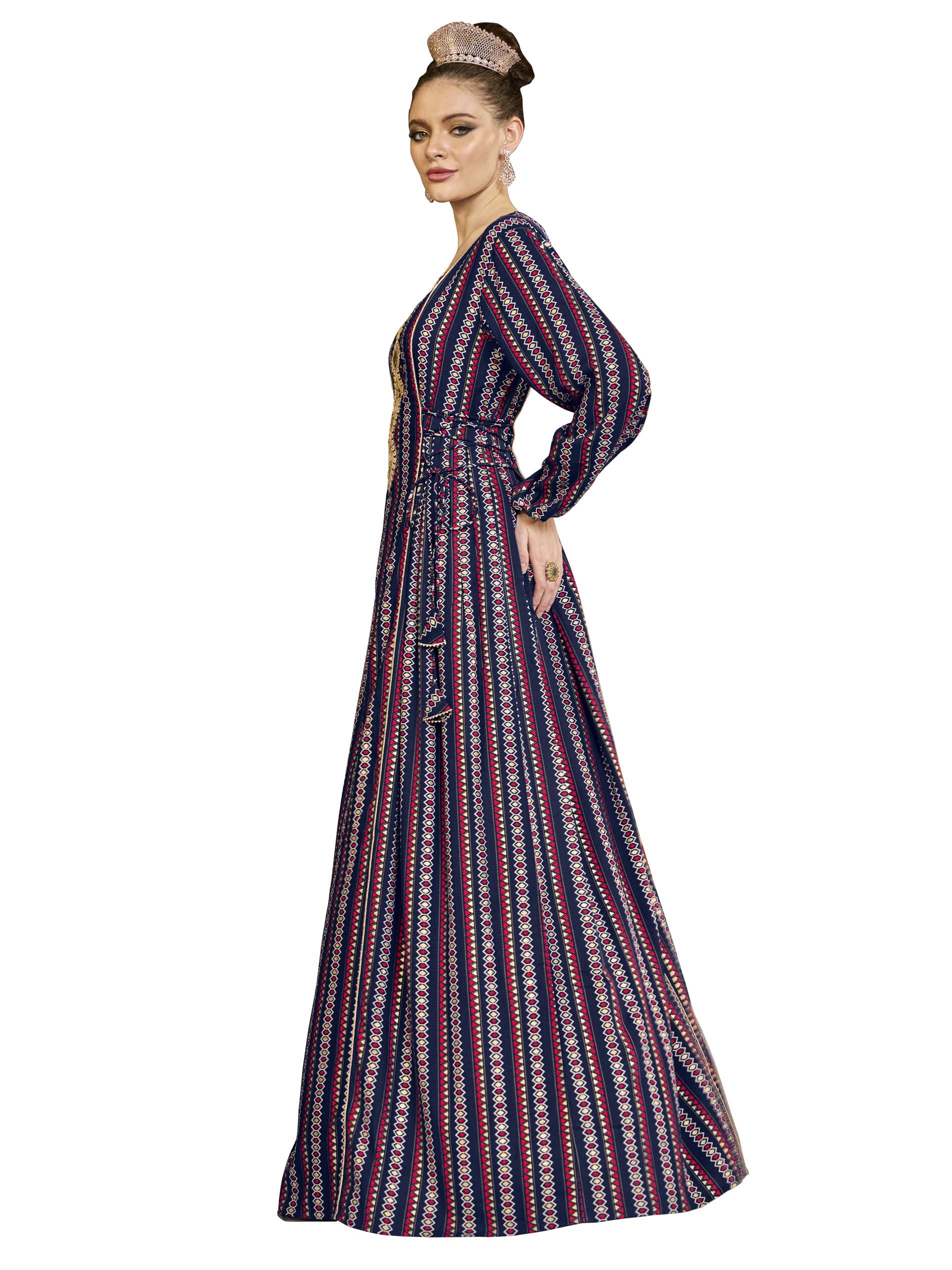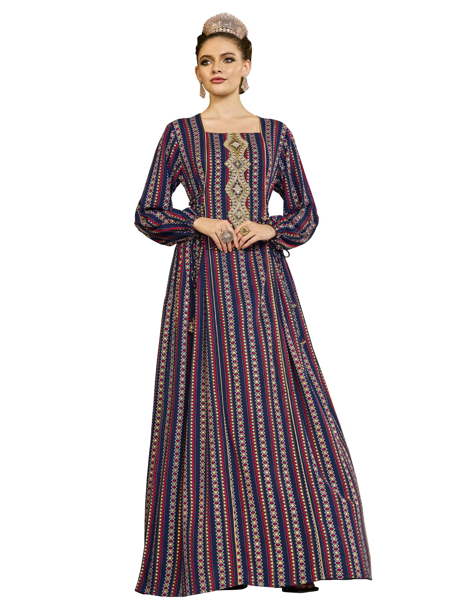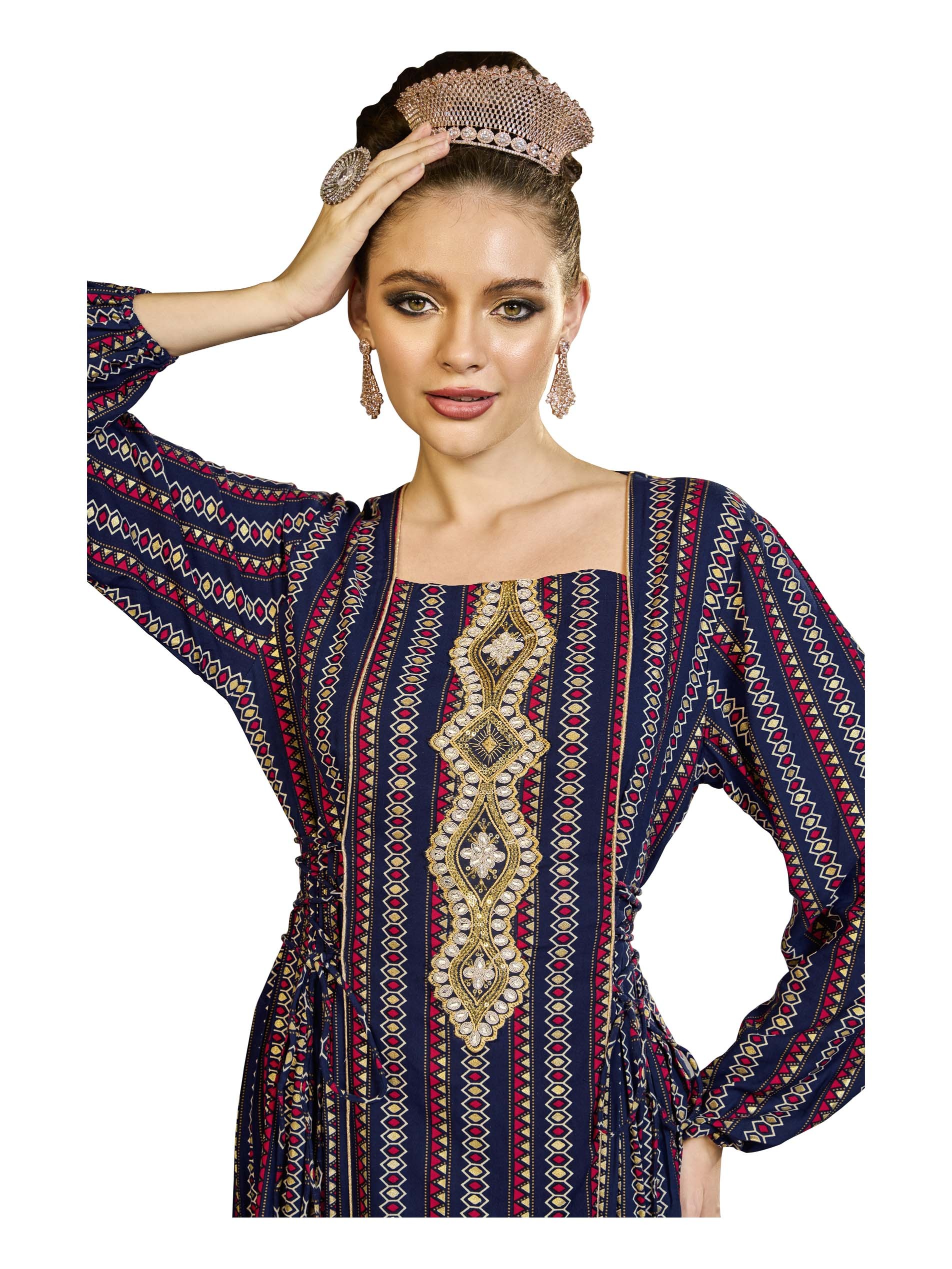 This loose-fitting jalabiya, made from breathable rayon, features bright red, navy and gold stripes, embellished with printed motifs and delicate embroidery at the neck. The adjustable belt at the waist ensures a comfortable fit, while the slim fit makes it perfect for Ramadan occasions. Chic and comfortable, this piece is perfect for summer celebrations.