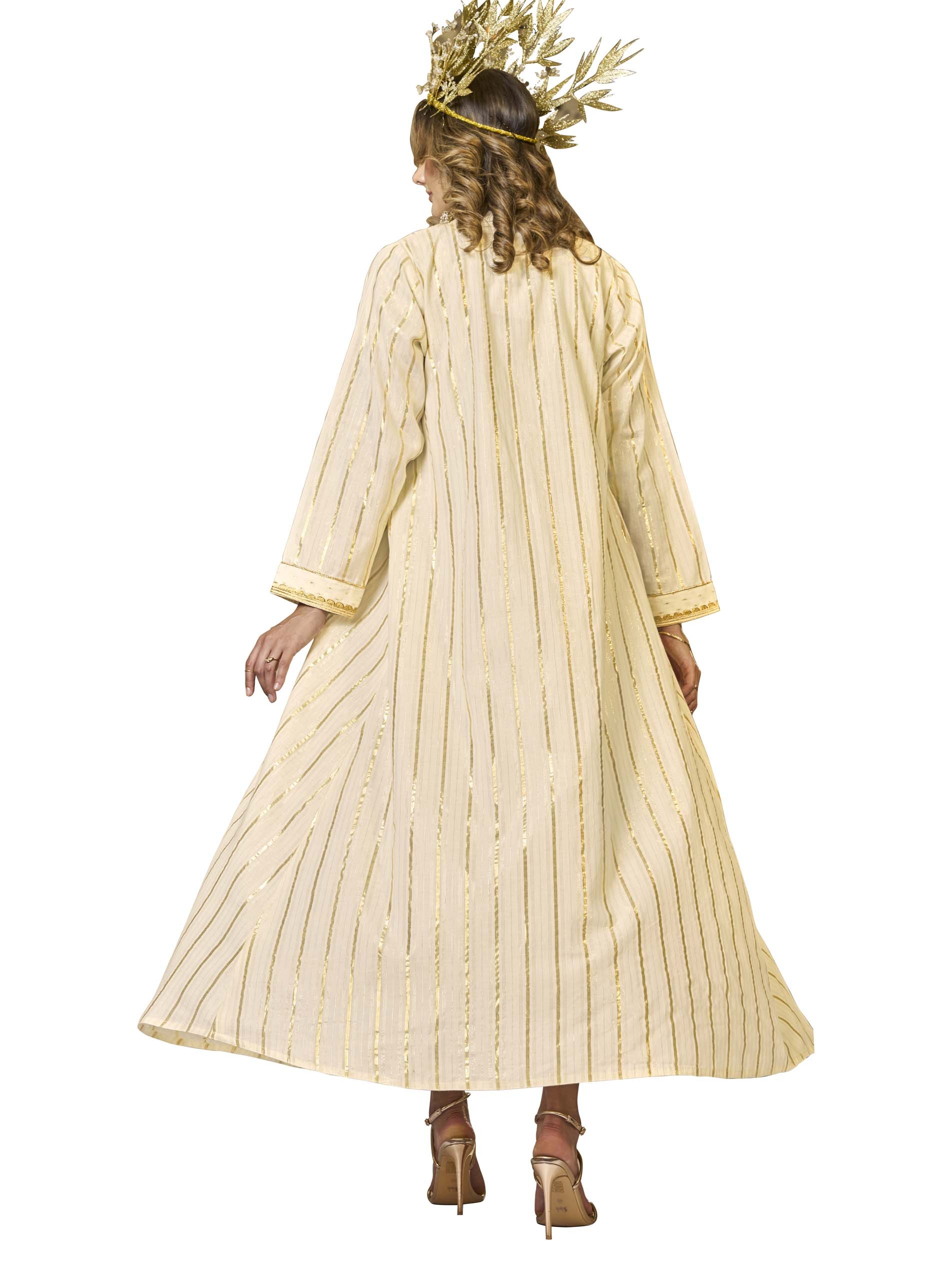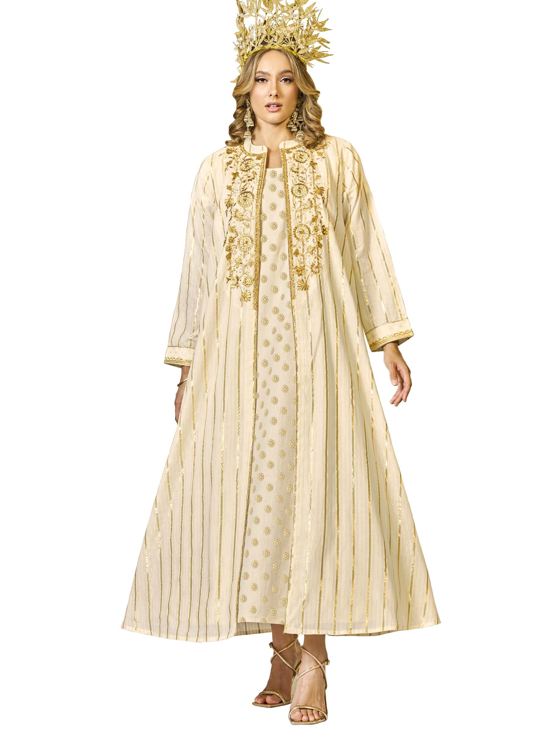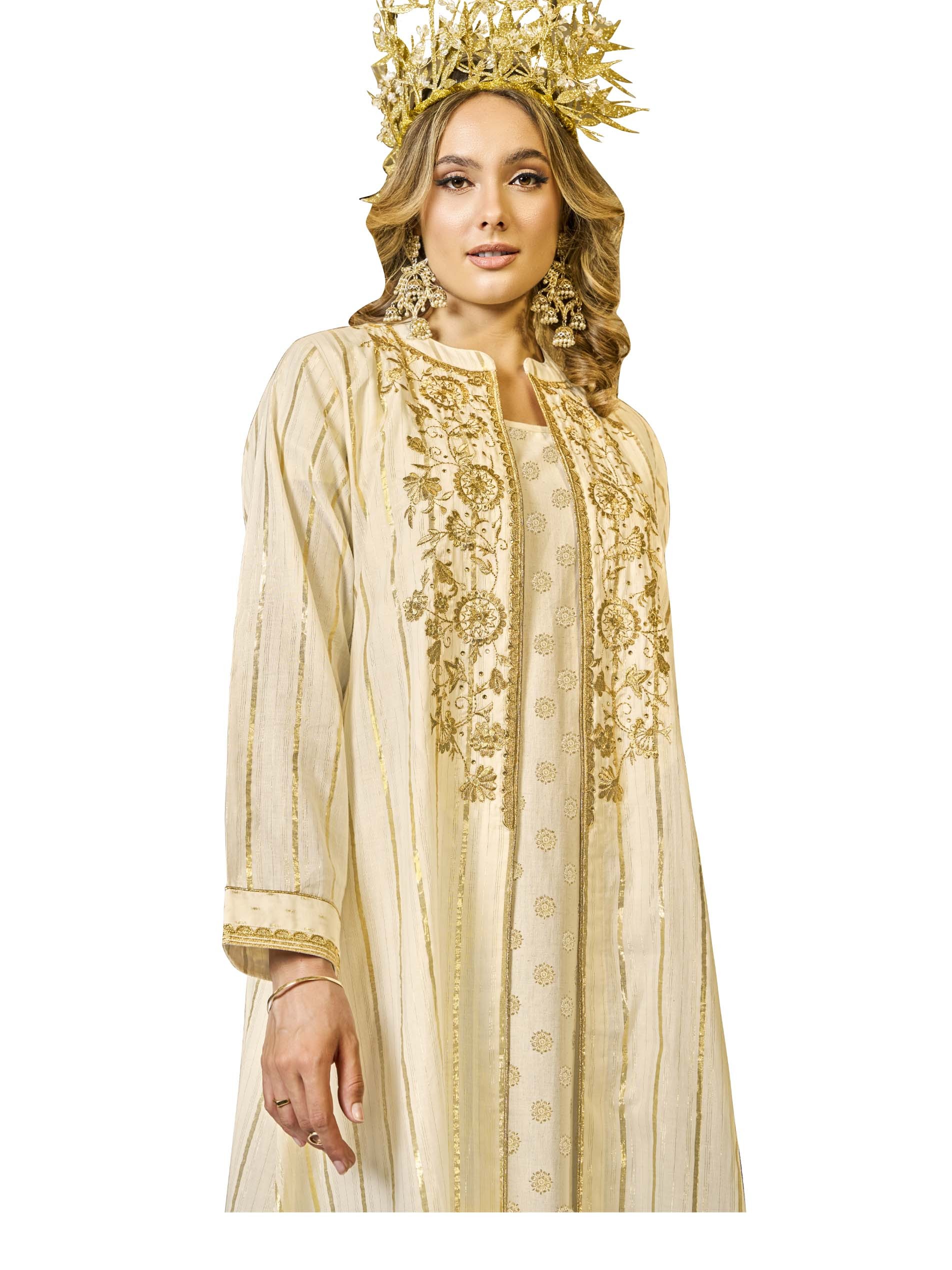 This two-piece jalabiya features a cotton jacket-style cut, perfect for summer. The jacket is adorned with shimmering golden lurex stripes, intricate embroidery, and embellishments, adding a luxurious touch, while the inner layer boasts delicate golden motifs that complement the design. Ideal for Ramadan celebrations, this combination exudes elegance and sophistication.