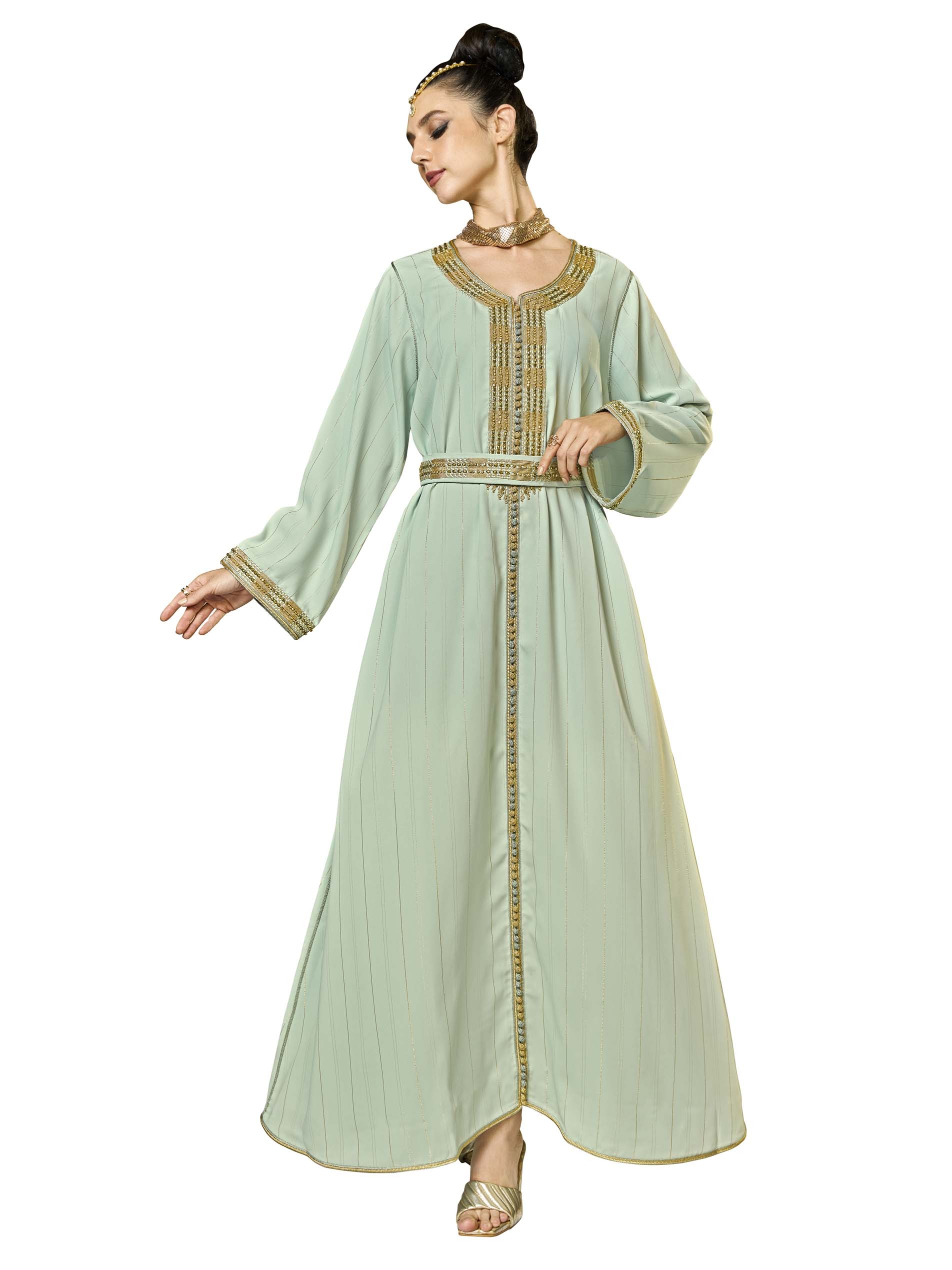 This elegant flared jalabiya, made from luxurious satin, features beautiful gold Moroccan detailing and intricate embroidery work on the neck and waist. The soft pastel green colour, enhanced with gold accents, creates a festive and elegant look, making it an ideal choice for Ramadan. The breathable fabric ensures comfort, making it an ideal choice for summer celebrations.