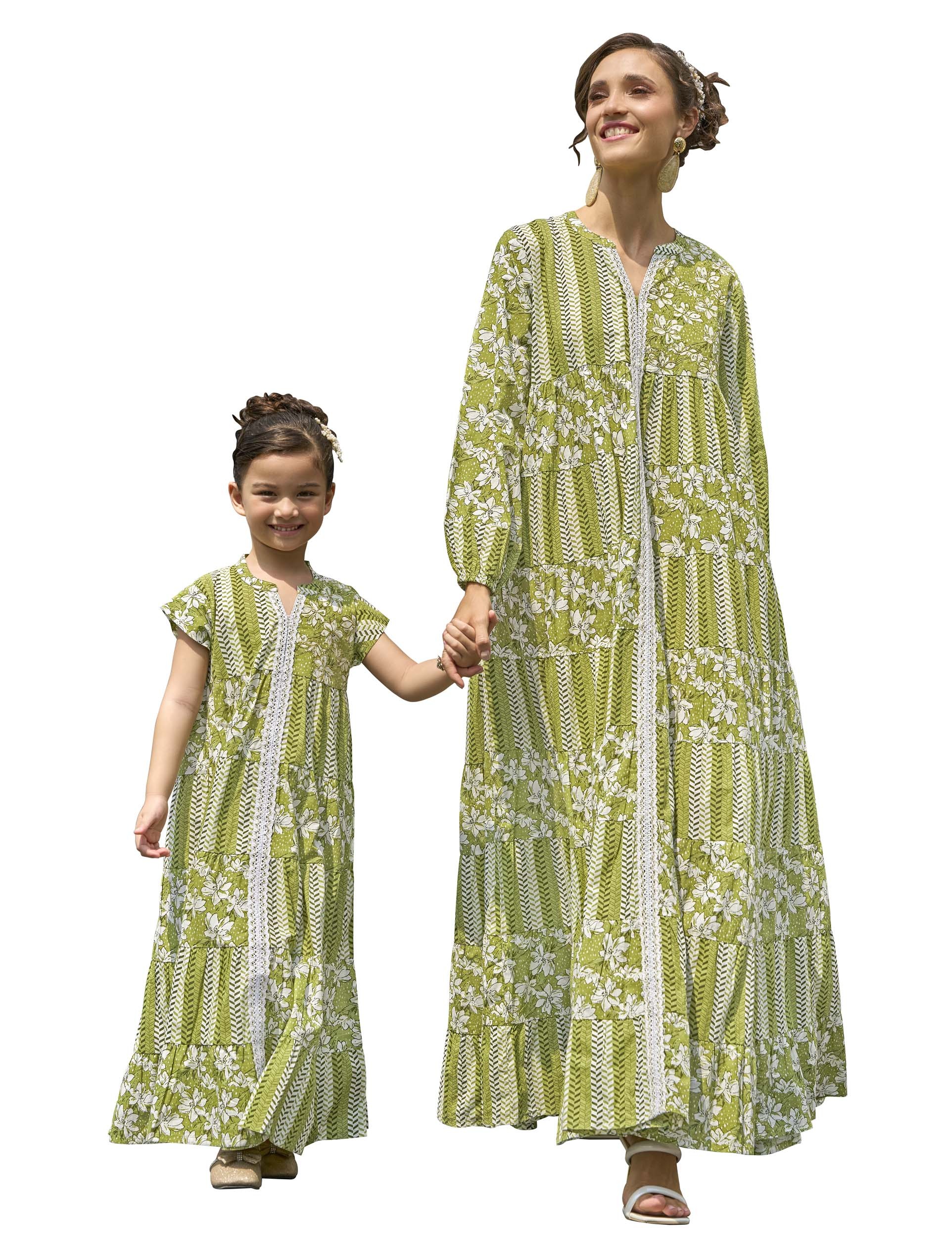 This playful flared jalabiya for kids, made from breathable cotton, is perfect for summer parties. Featuring a fun patchwork design with olive green and white floral motifs, chevron and stripe patterns, and tiered layers, it adds a vibrant touch. The lace panel, golden embroidery, and cut sleeves ensure both comfort and style, allowing your little ones to move freely and look adorable.