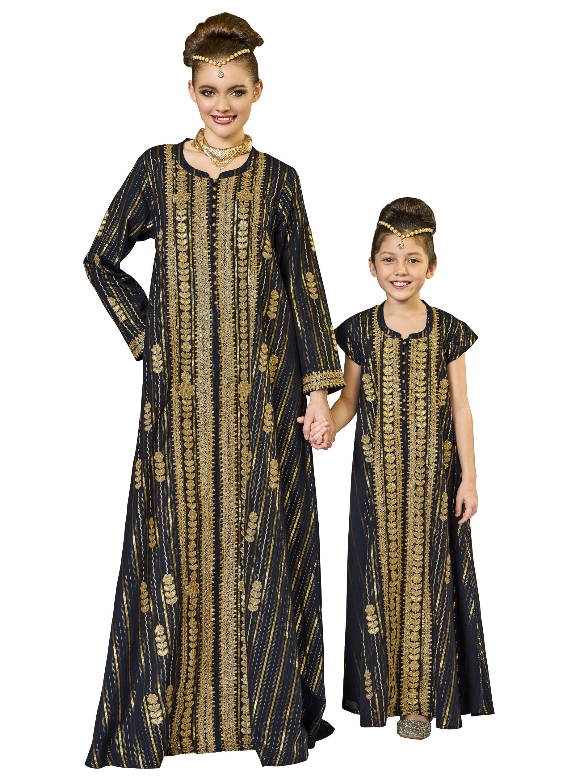 This kids' flared jalabiya, made from breathable cotton, features elegant gold lace and intricate embroidery work. It combines striking lines with a beautiful festive design, making it perfect for Ramadan and summer occasions. Its flared cut ensures comfort and style, making it a standout piece for your child's celebrations.