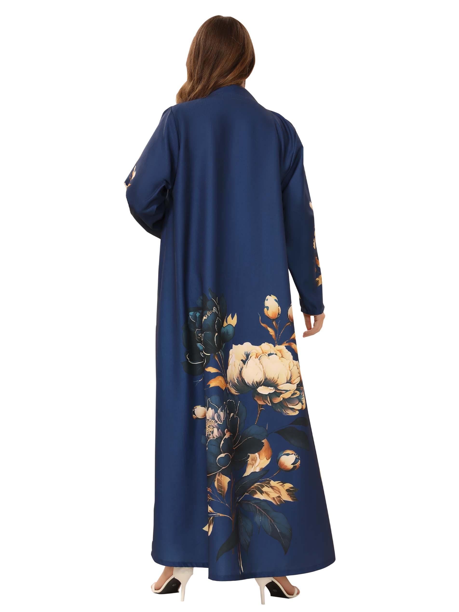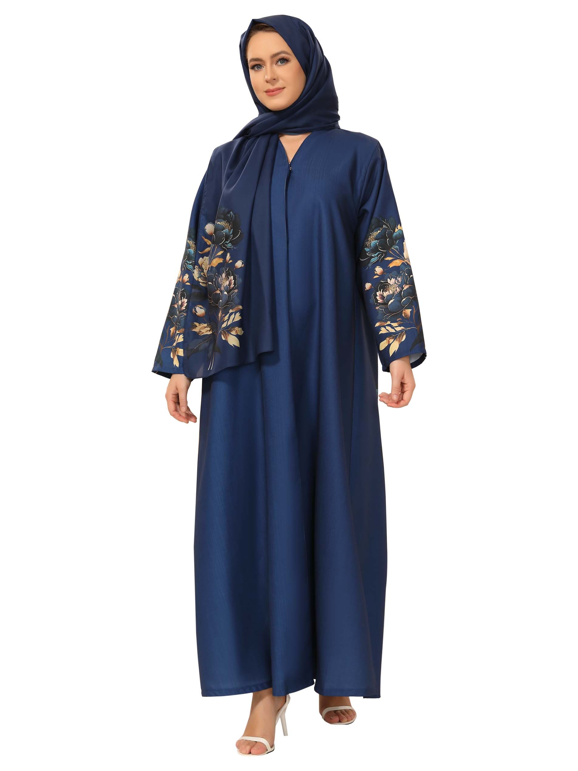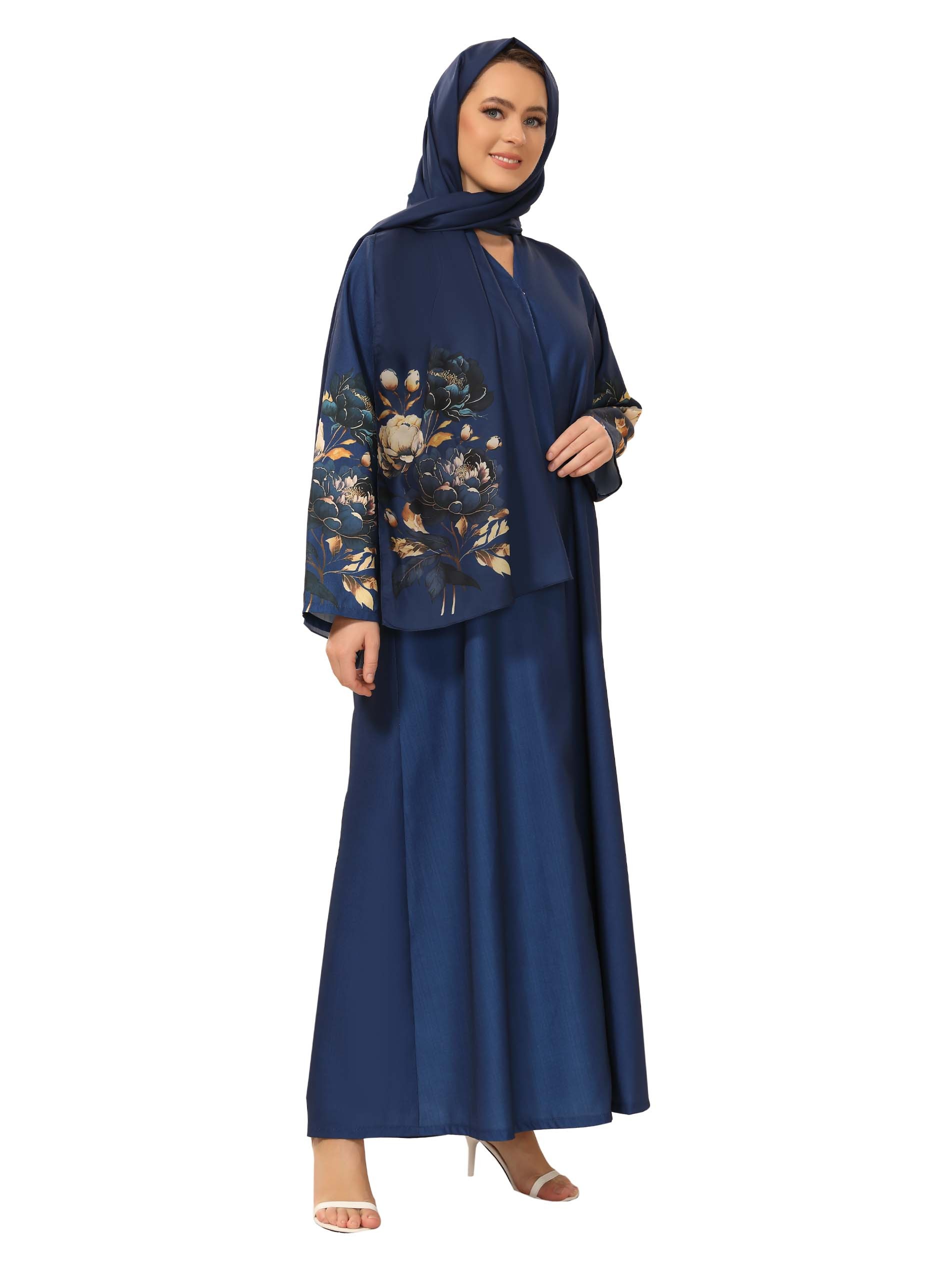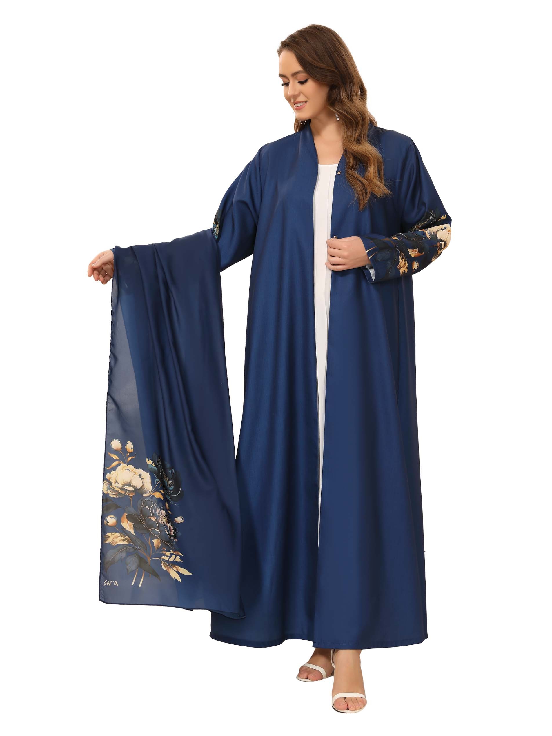 Enhance your confidence at work with our blue linen abaya that comes with a beautiful floral scarf to complete your elegance.