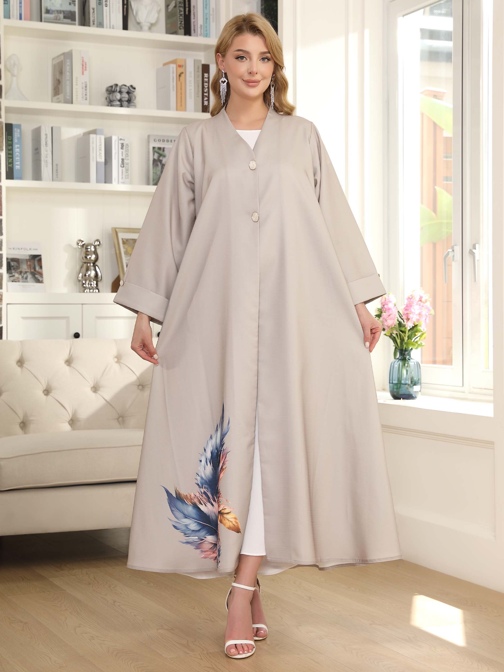 Nothing beats an A-line gray linen abaya, designed with a colorful pattern and front buttons to complete your charm.