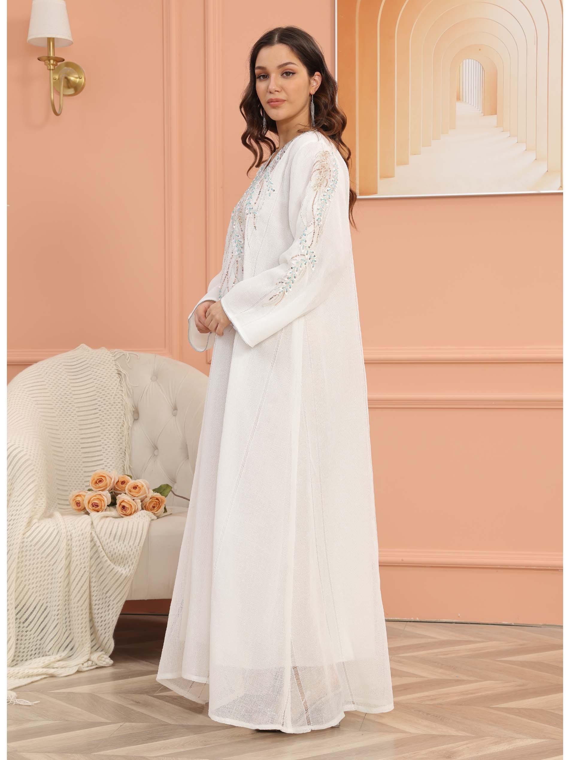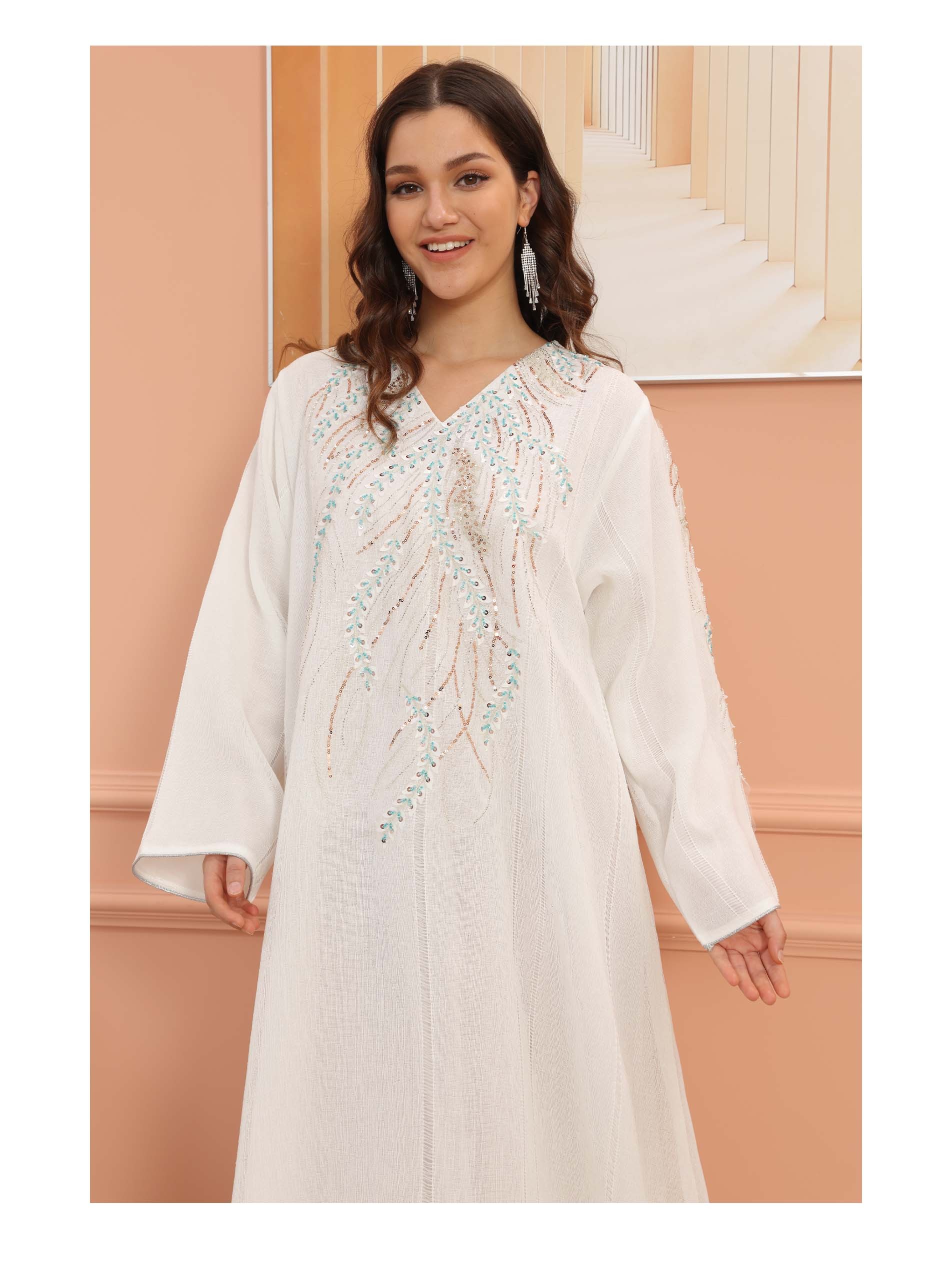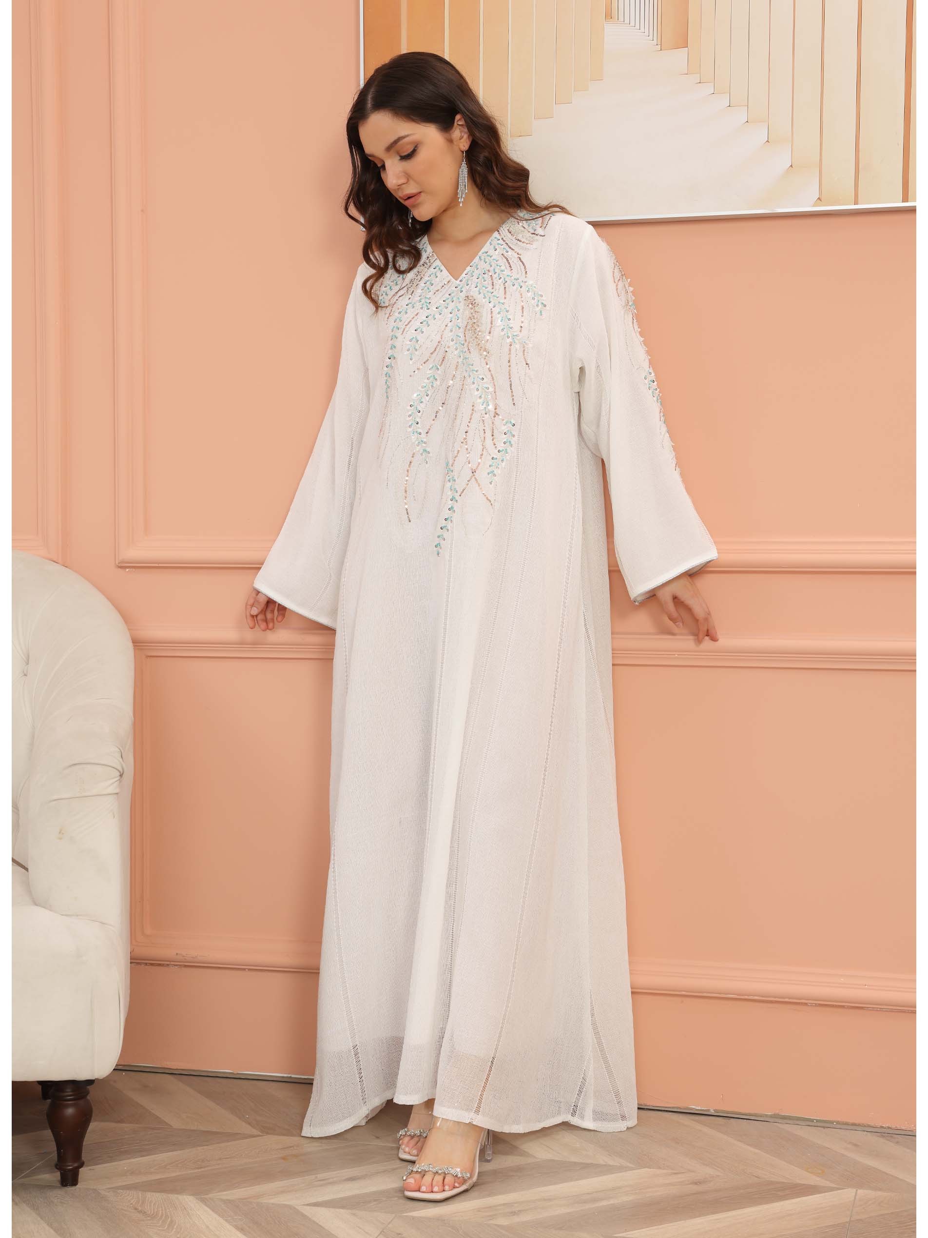 Long sleeve white linen jalabiya, embroidered with sequins for those perfect summer days.