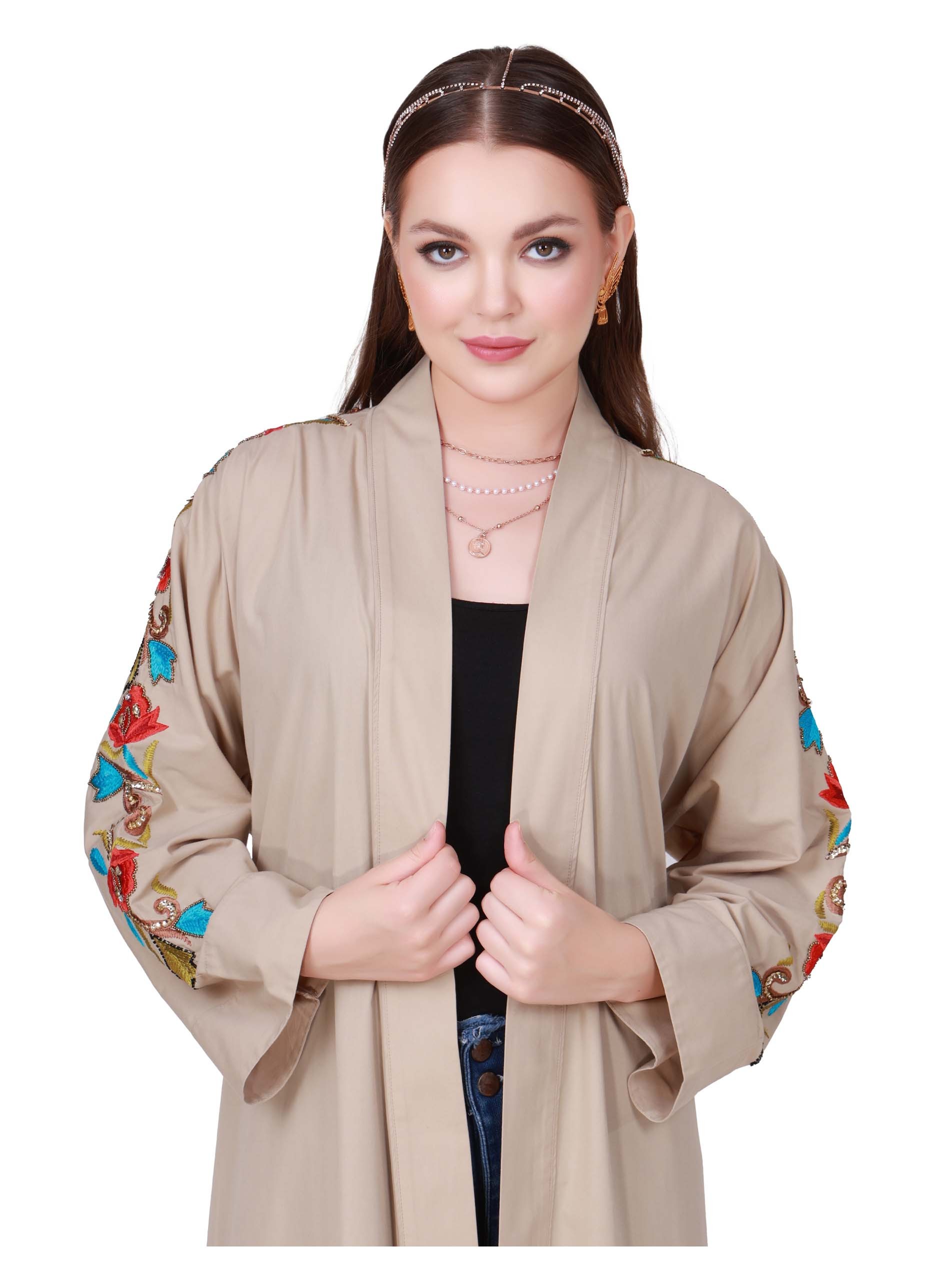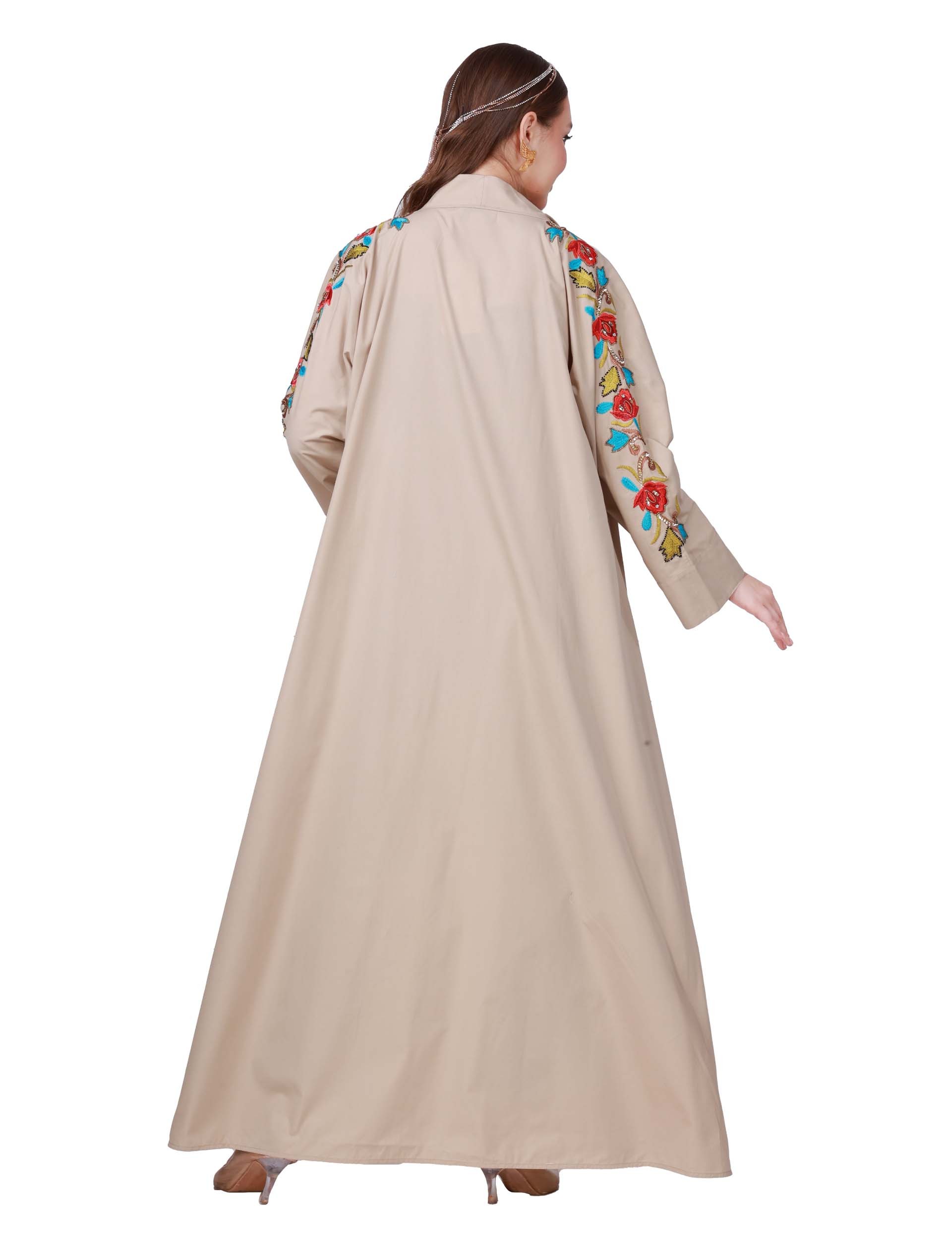 Beige maxi A-line open jalabiya, made of cotton, printed with colorful floral designs on the sleeves for an outstanding party look.