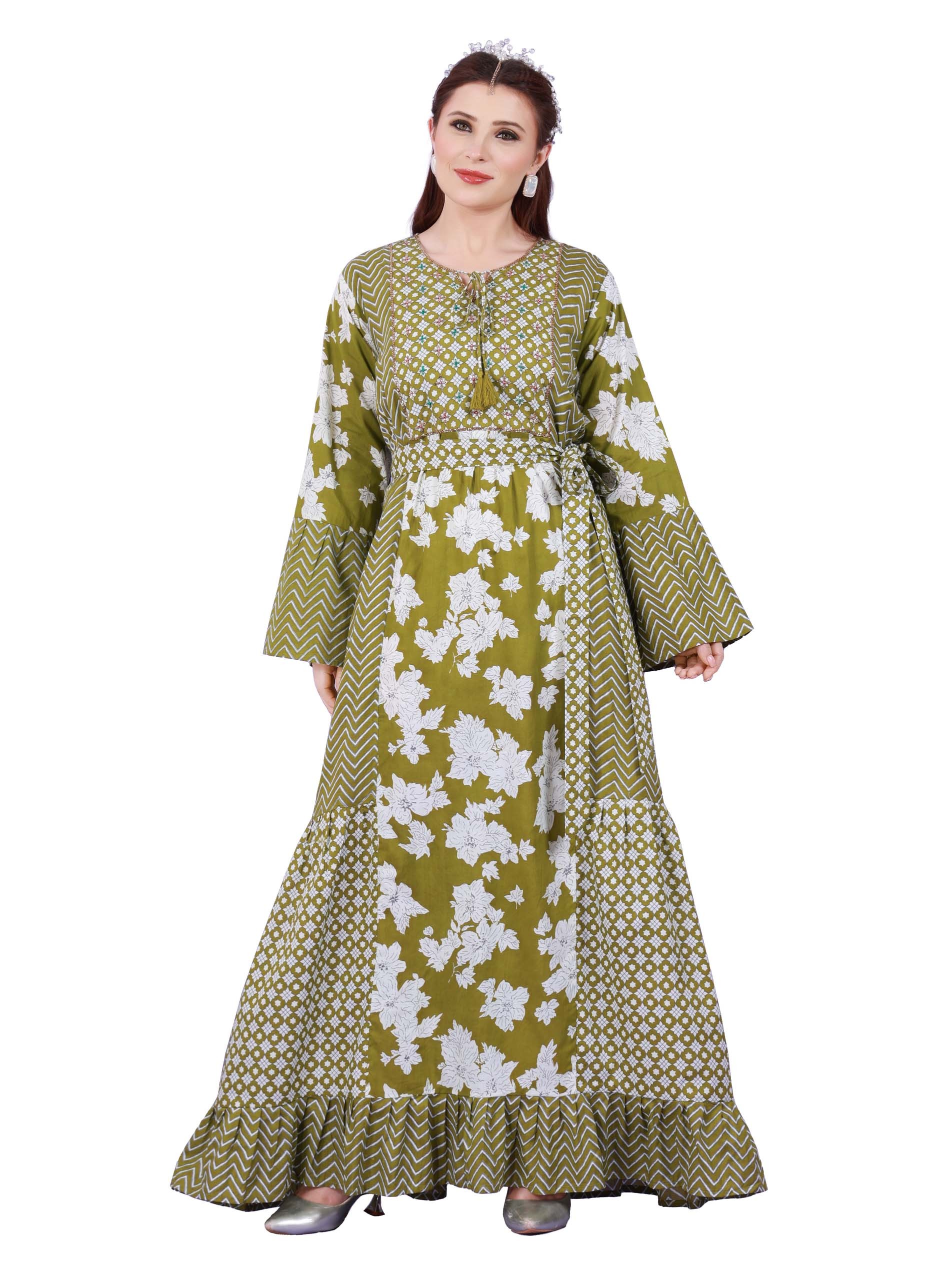 Our green cotton jalabiya is a perfect choice for parties with its diversified white patterns and tie details on the waist to give you a classy look.