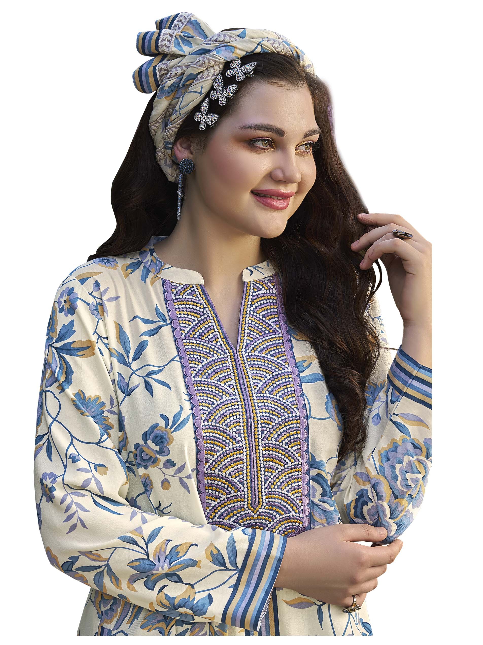 Enjoy this stunning rayon jalabiya, designed with blue & white floral patterns, complemented with long sleeves and exquisite embroidery on the chest.