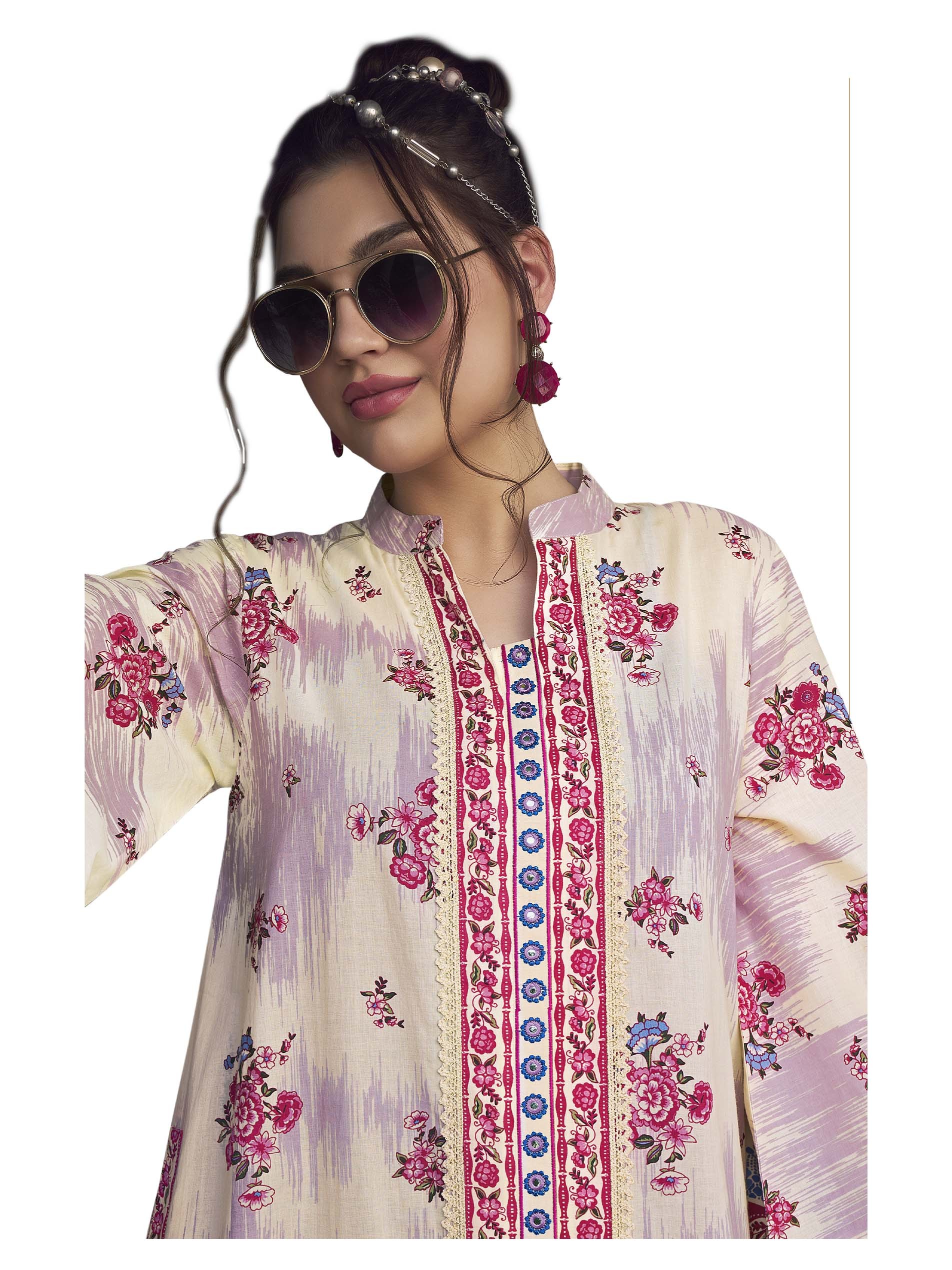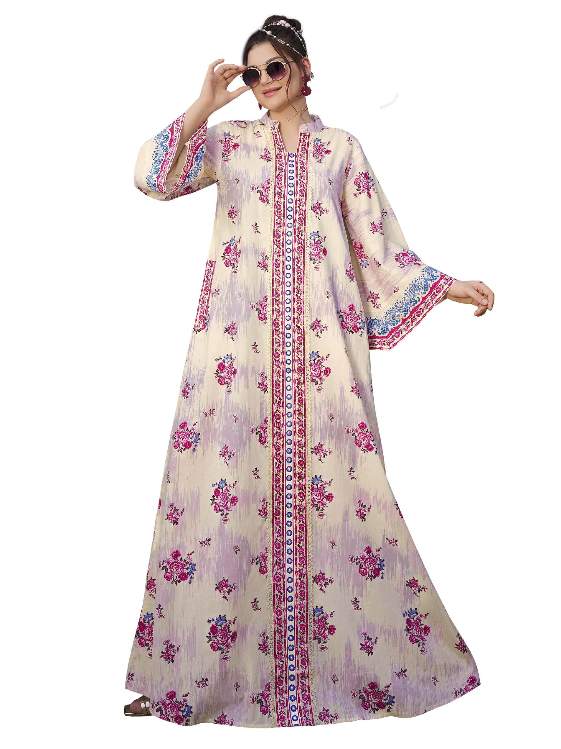 Enjoy a distinctive look in this cambric cotton jalabiya, designed with pink & white floral print. The design is complemented with blue embroidery on the sleeves.