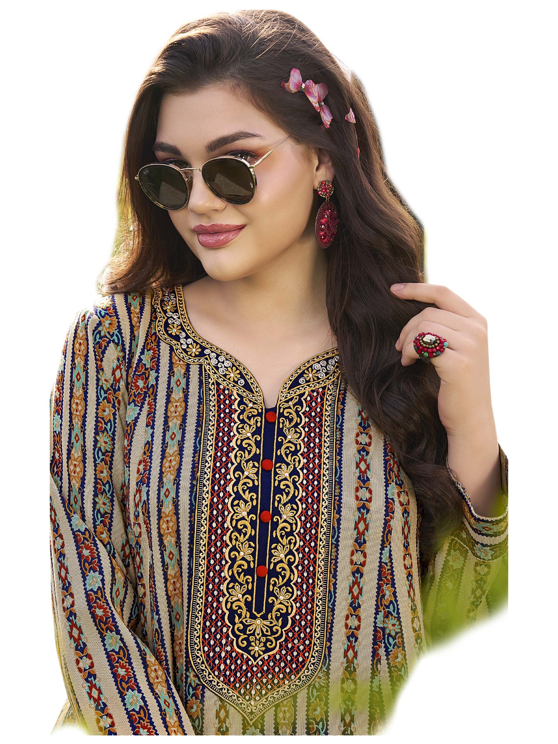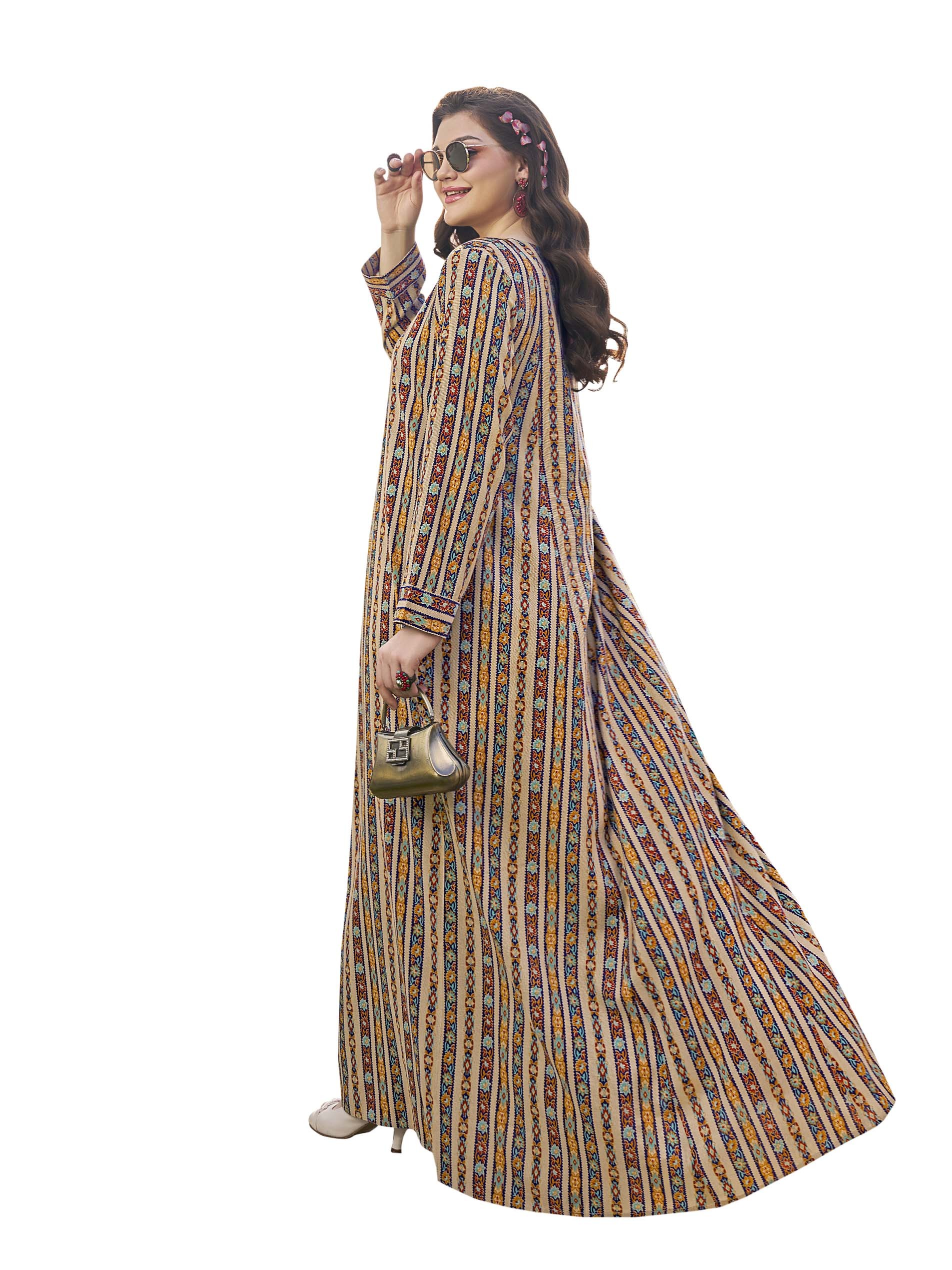 Stand out in this colorful and cheerful cotton jalabiya, designed with a small floral print in red, blue & orange with embroidery on the chest and front buttons.