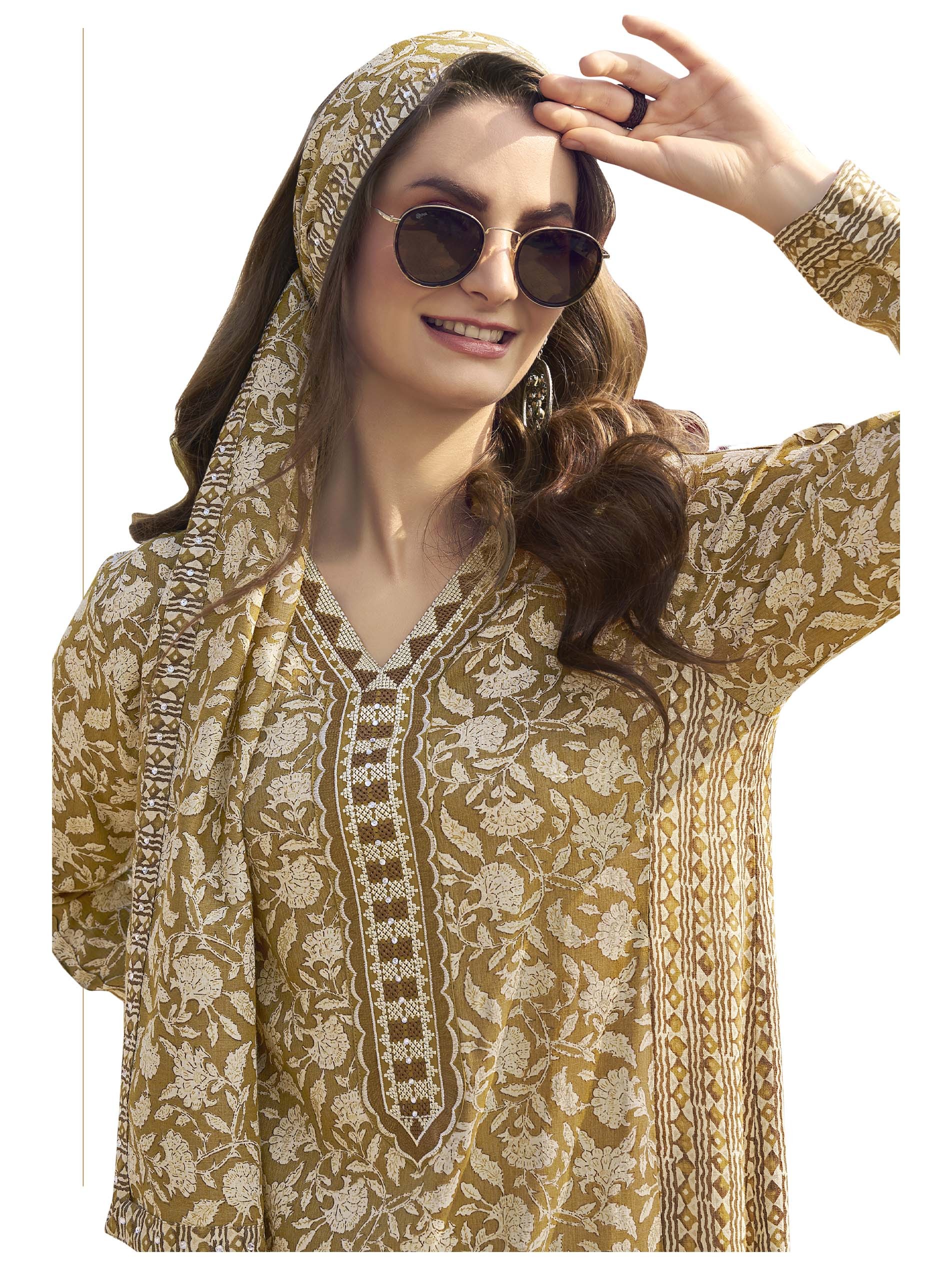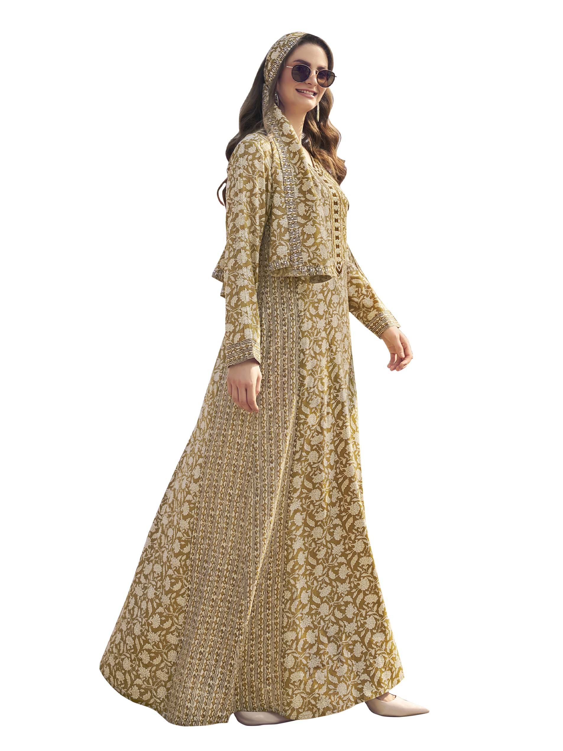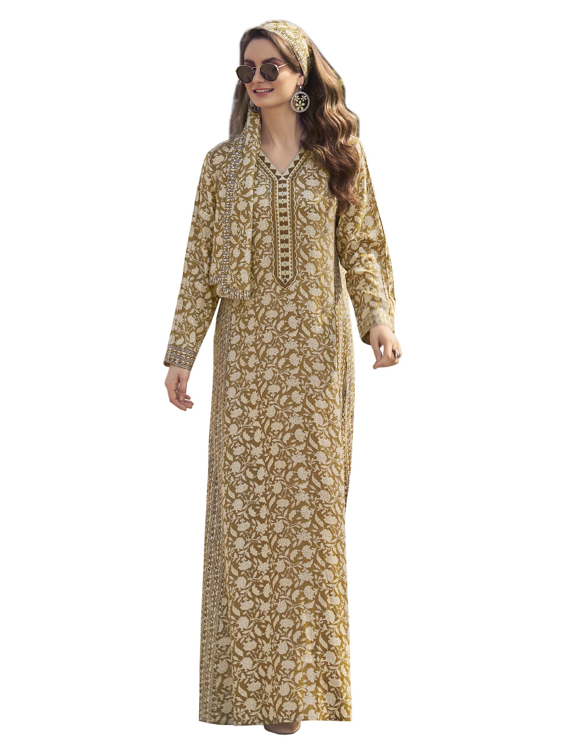 This brown jalabiya features a white floral print for a distinctive summer look. The design is completed with long sleeves and exquisite embroidery on the chest.