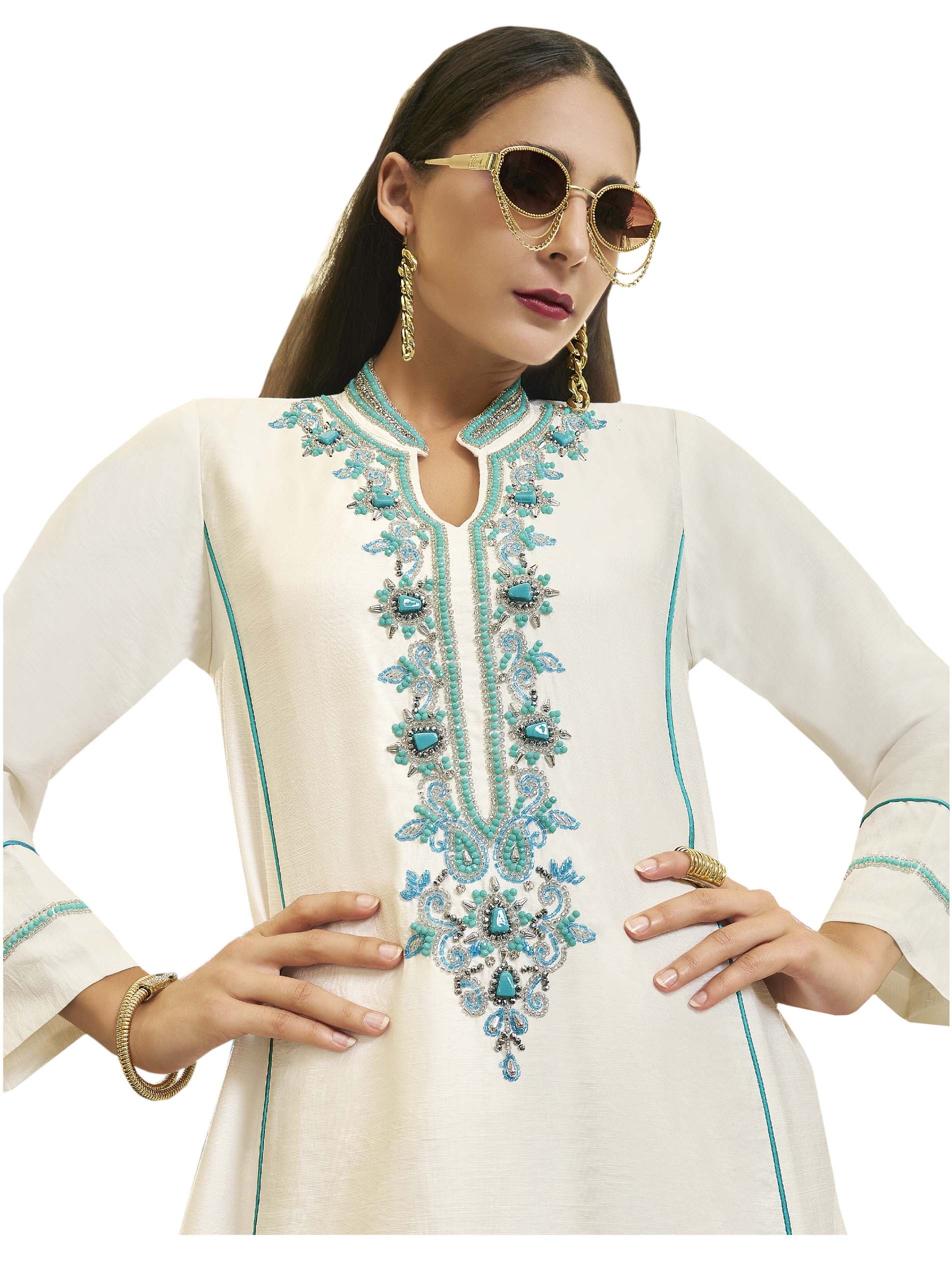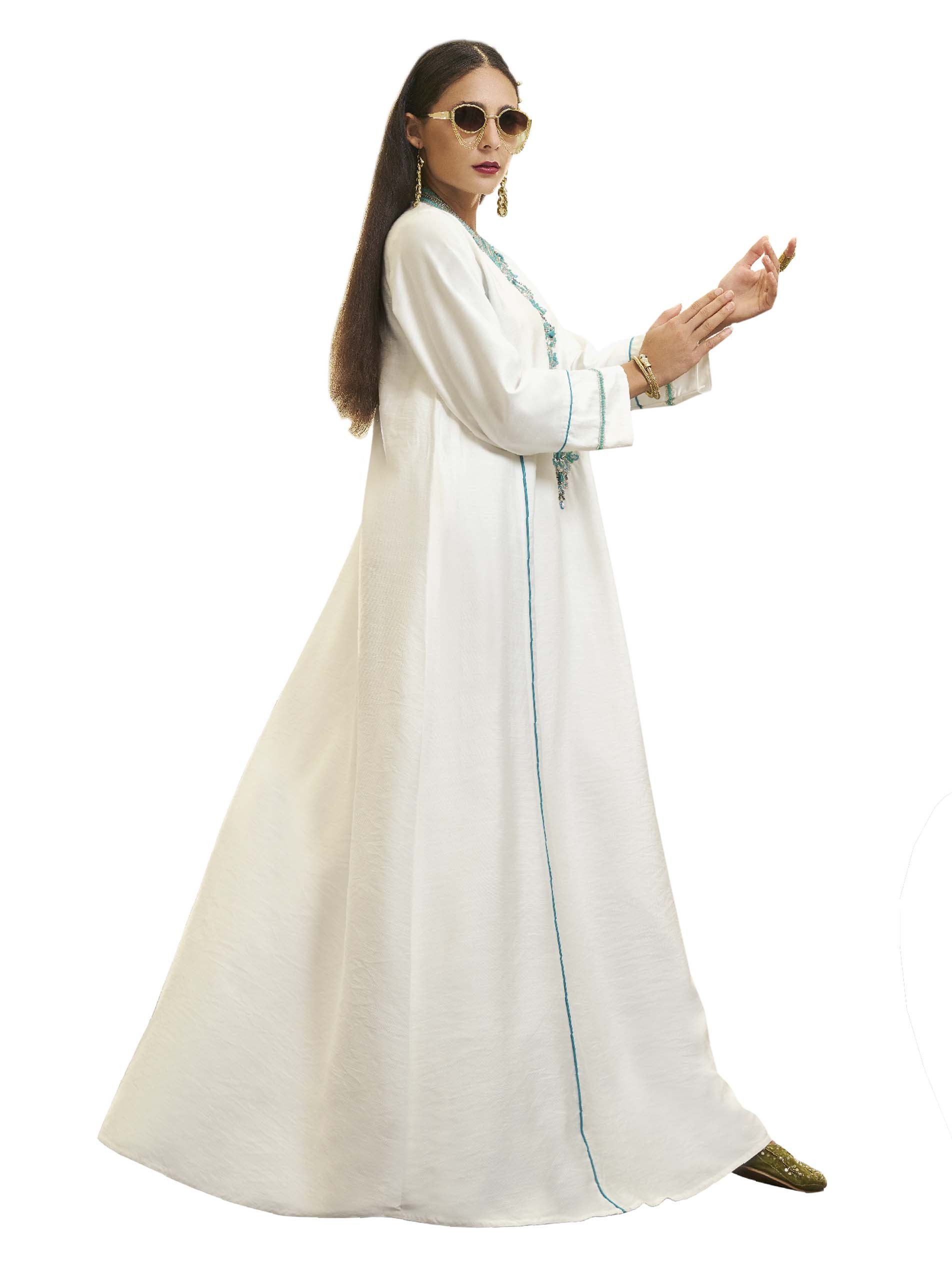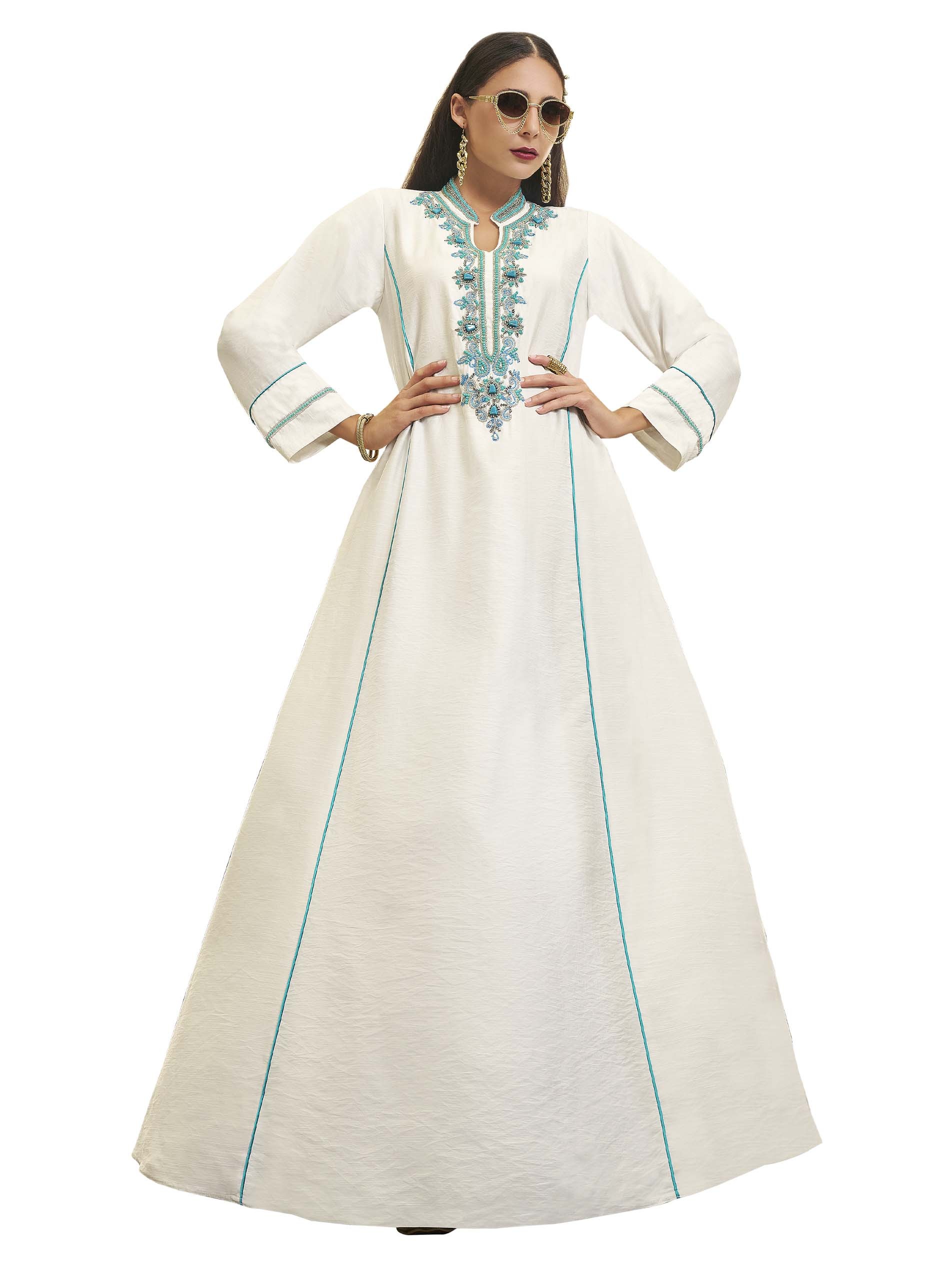 White maxi jalabiya, interpersed with blue colour, featuring a design that combines softness with luxury, complemented with a spectacular floral chest design.