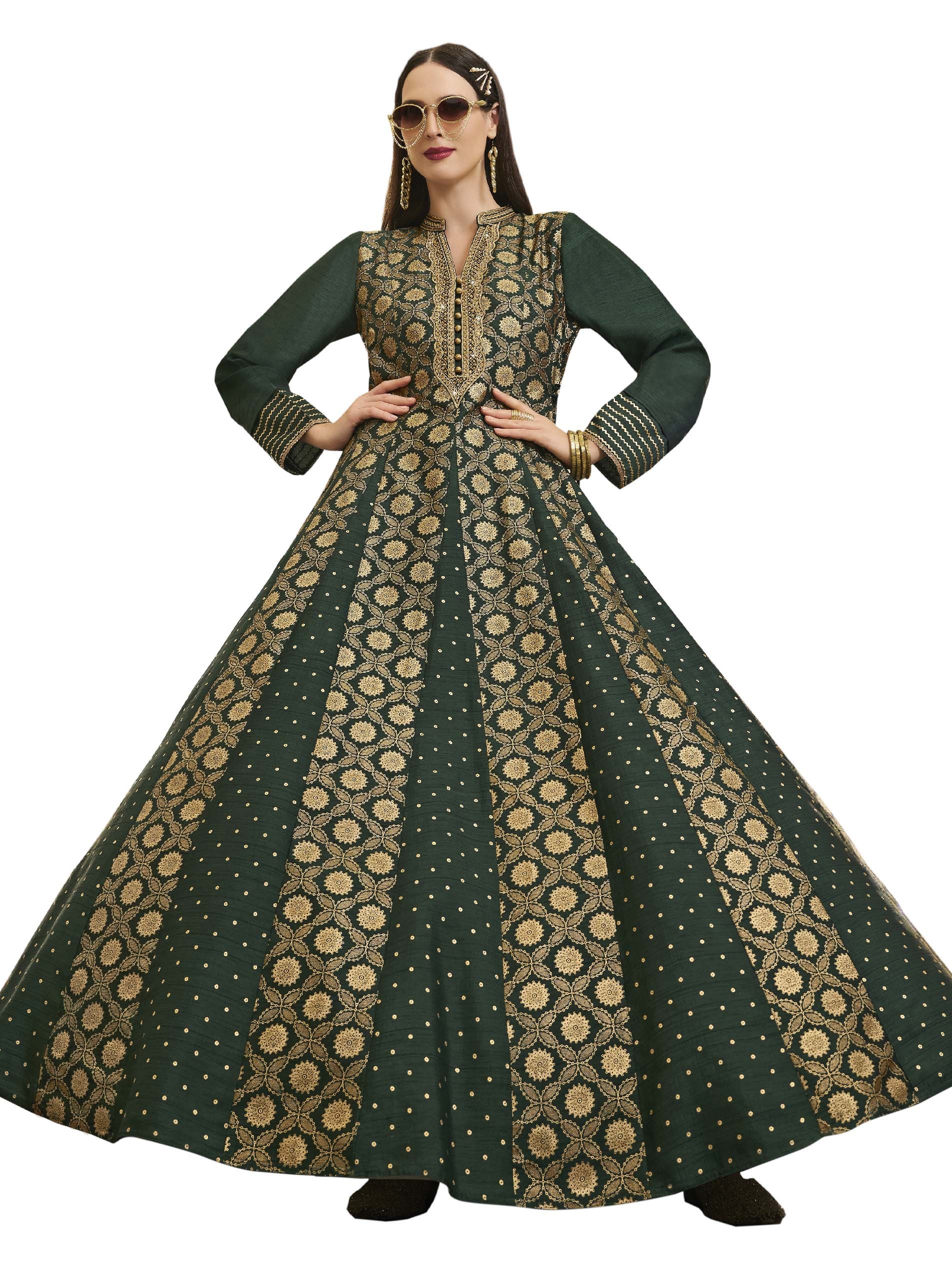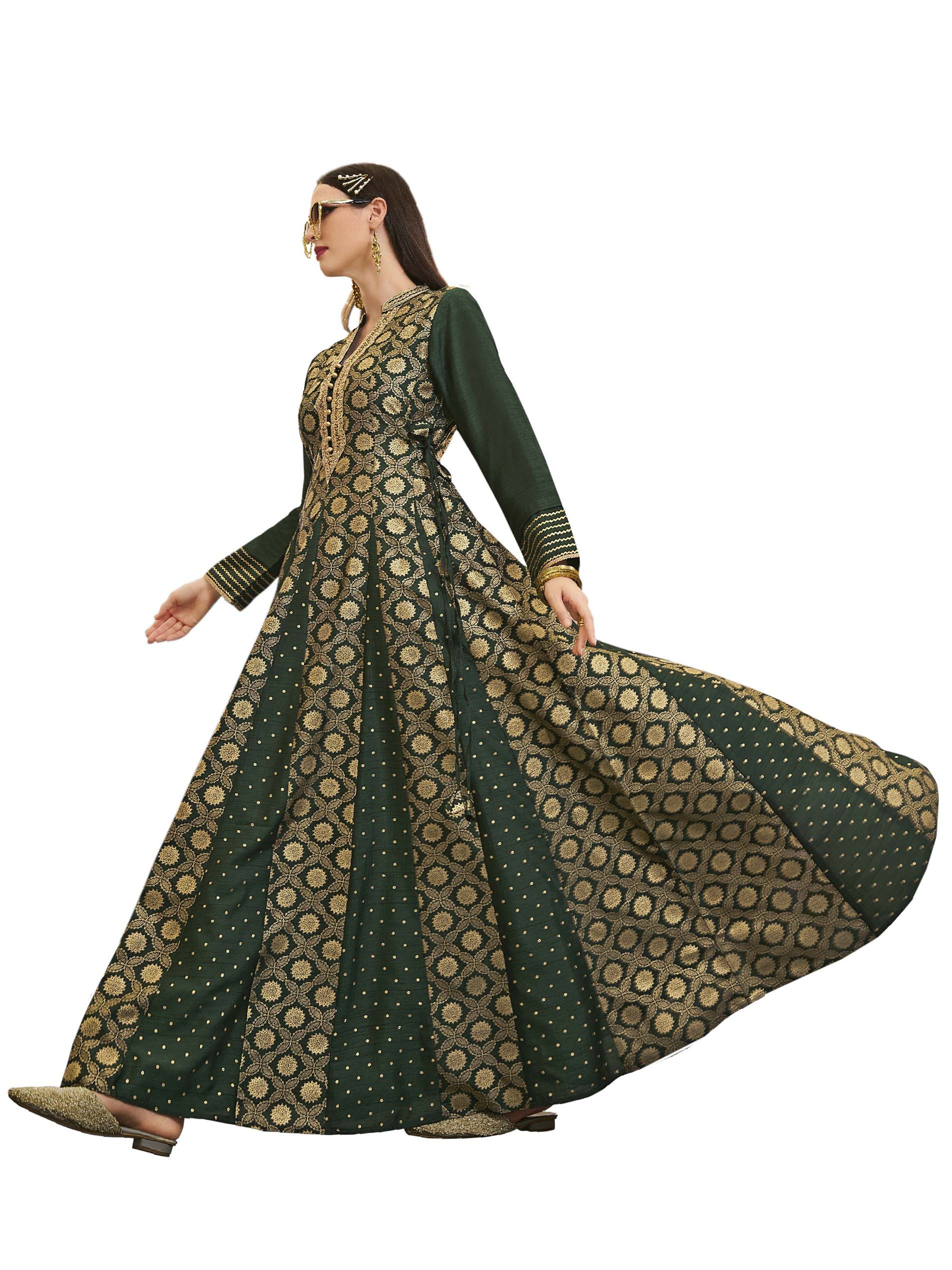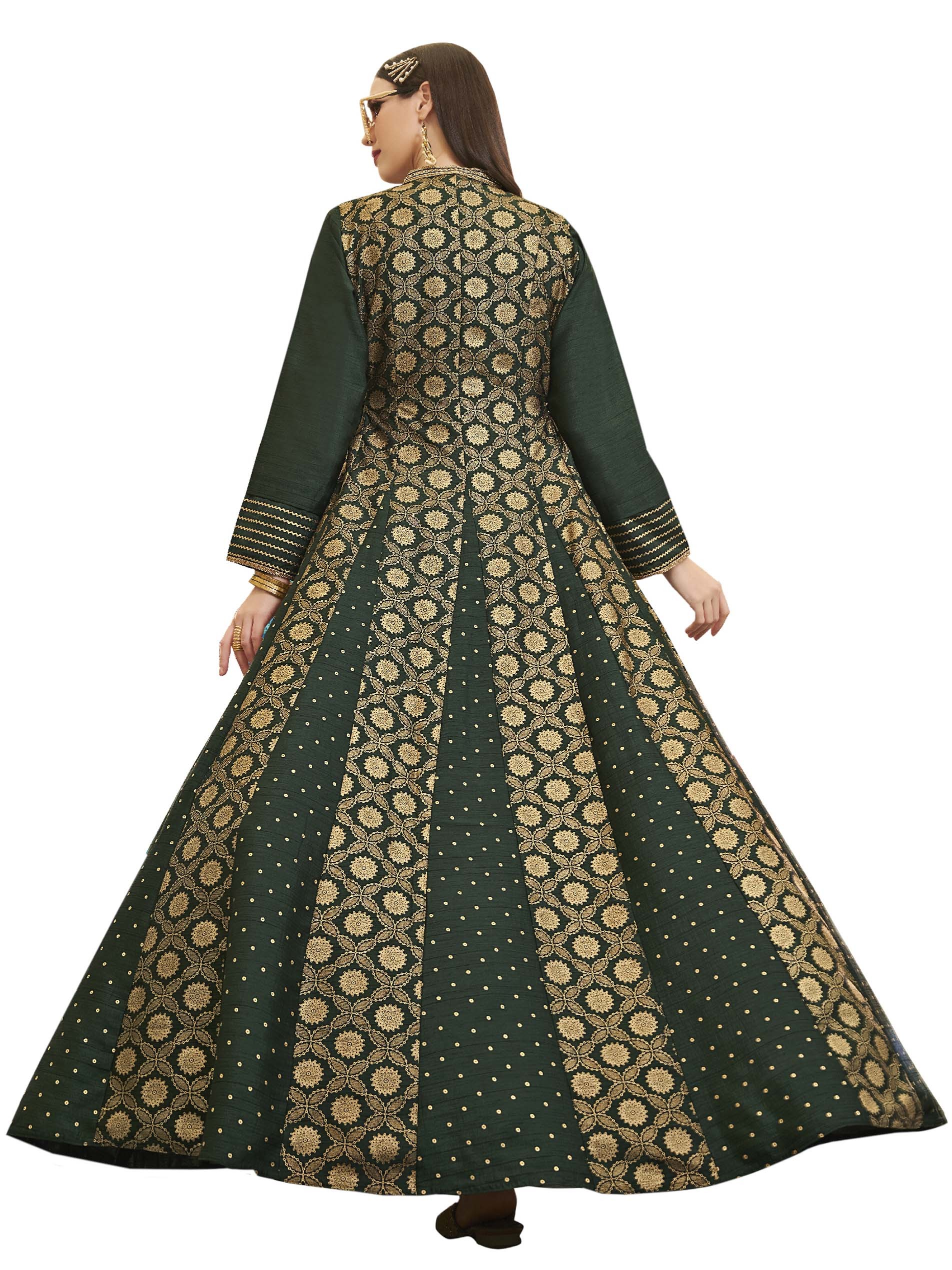 Royal green cotton jalabiya, designed with golden artwork and unique white patterns with long sleeves and front buttons.