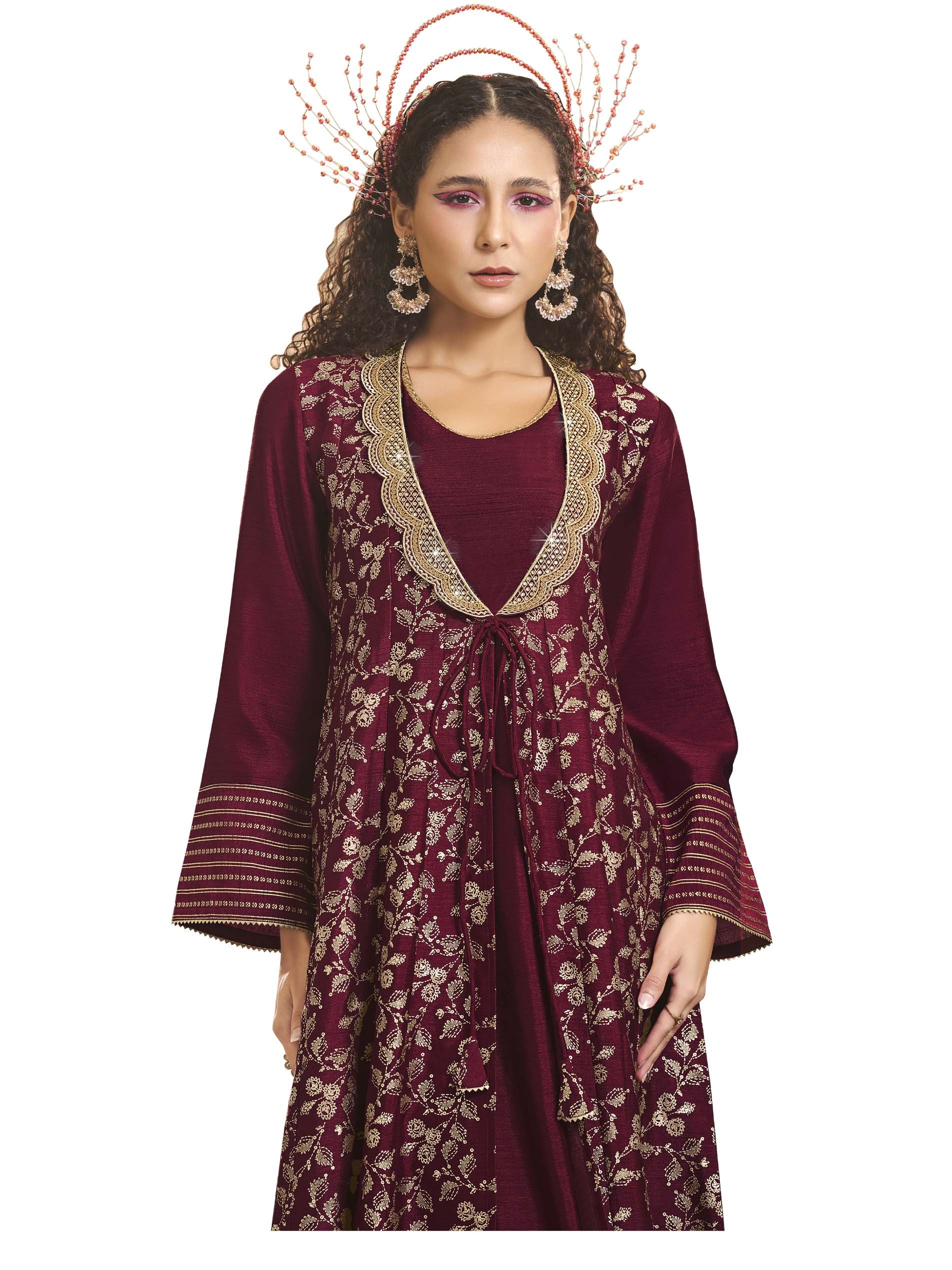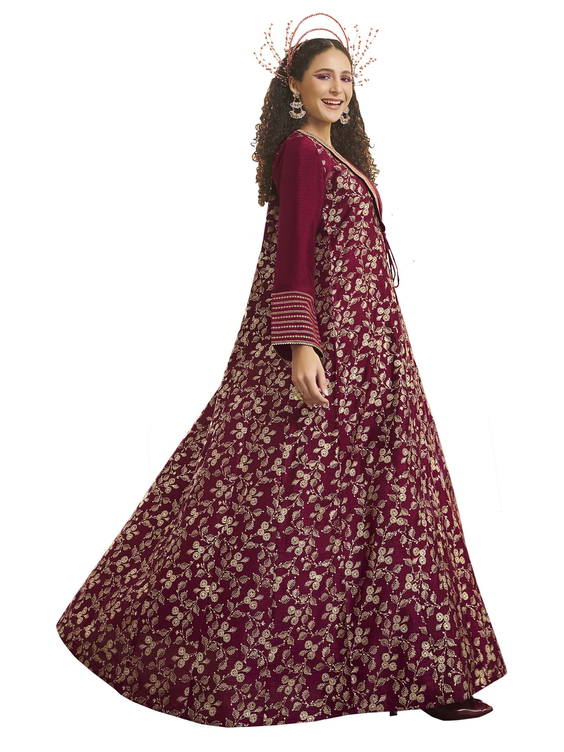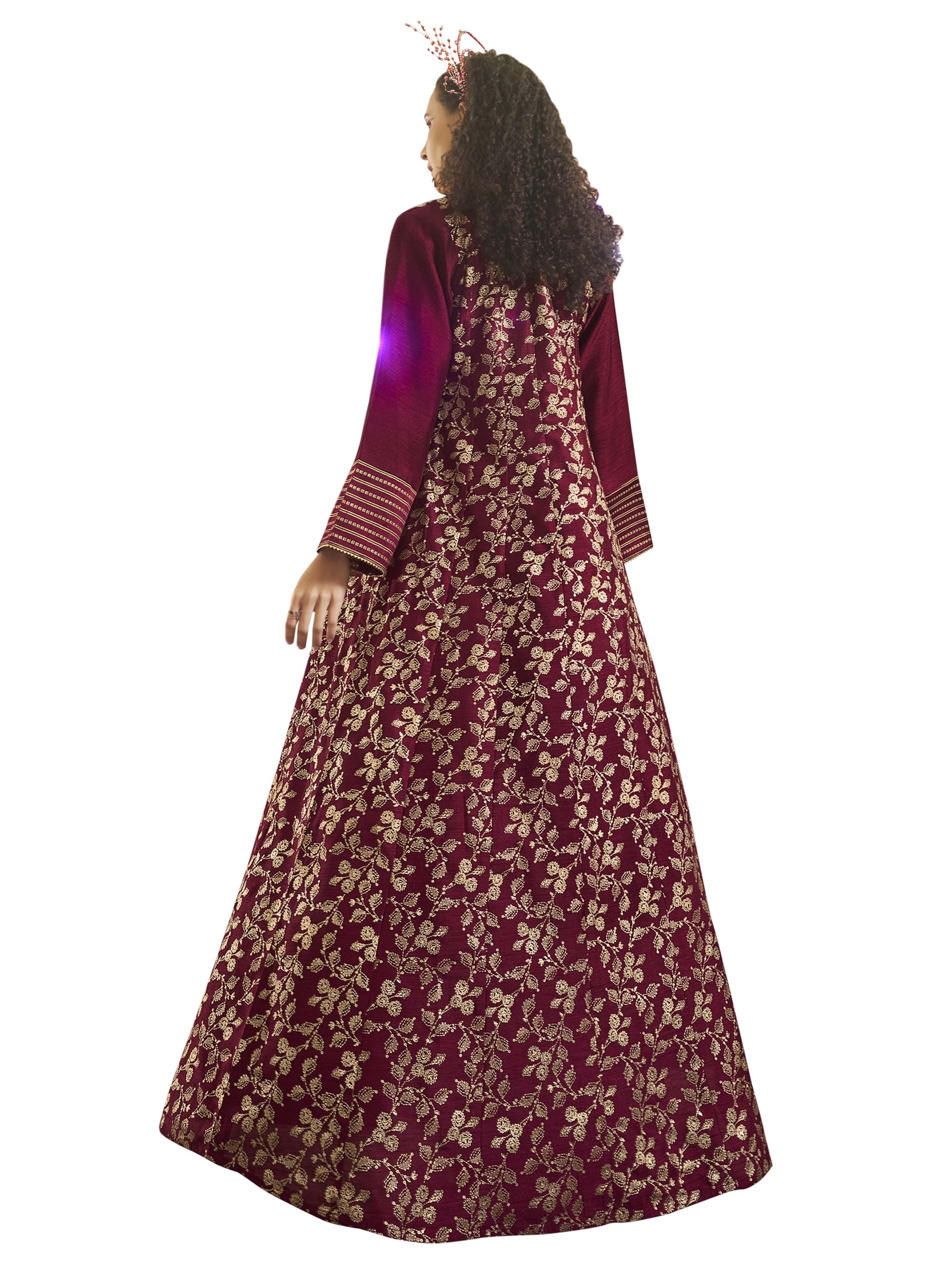 Long sleeve luxury velvet satin maxi jalabiya, designed with floral white pattern and distinctive neck cut.