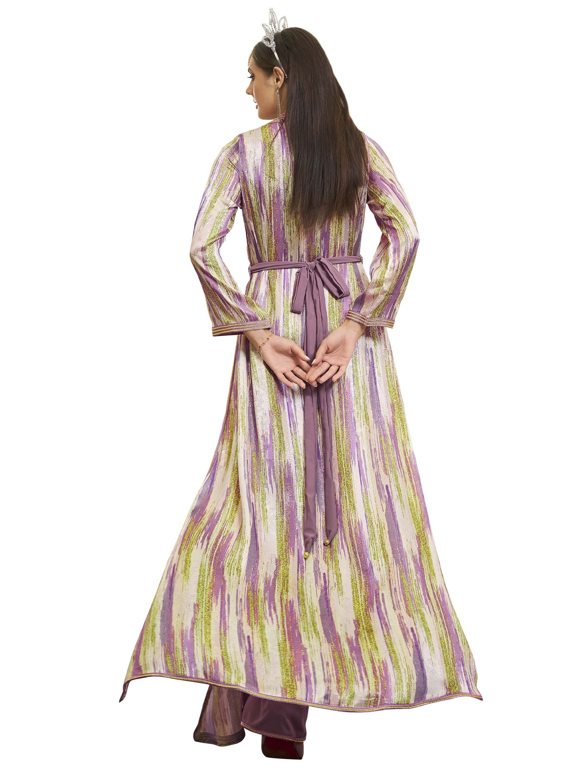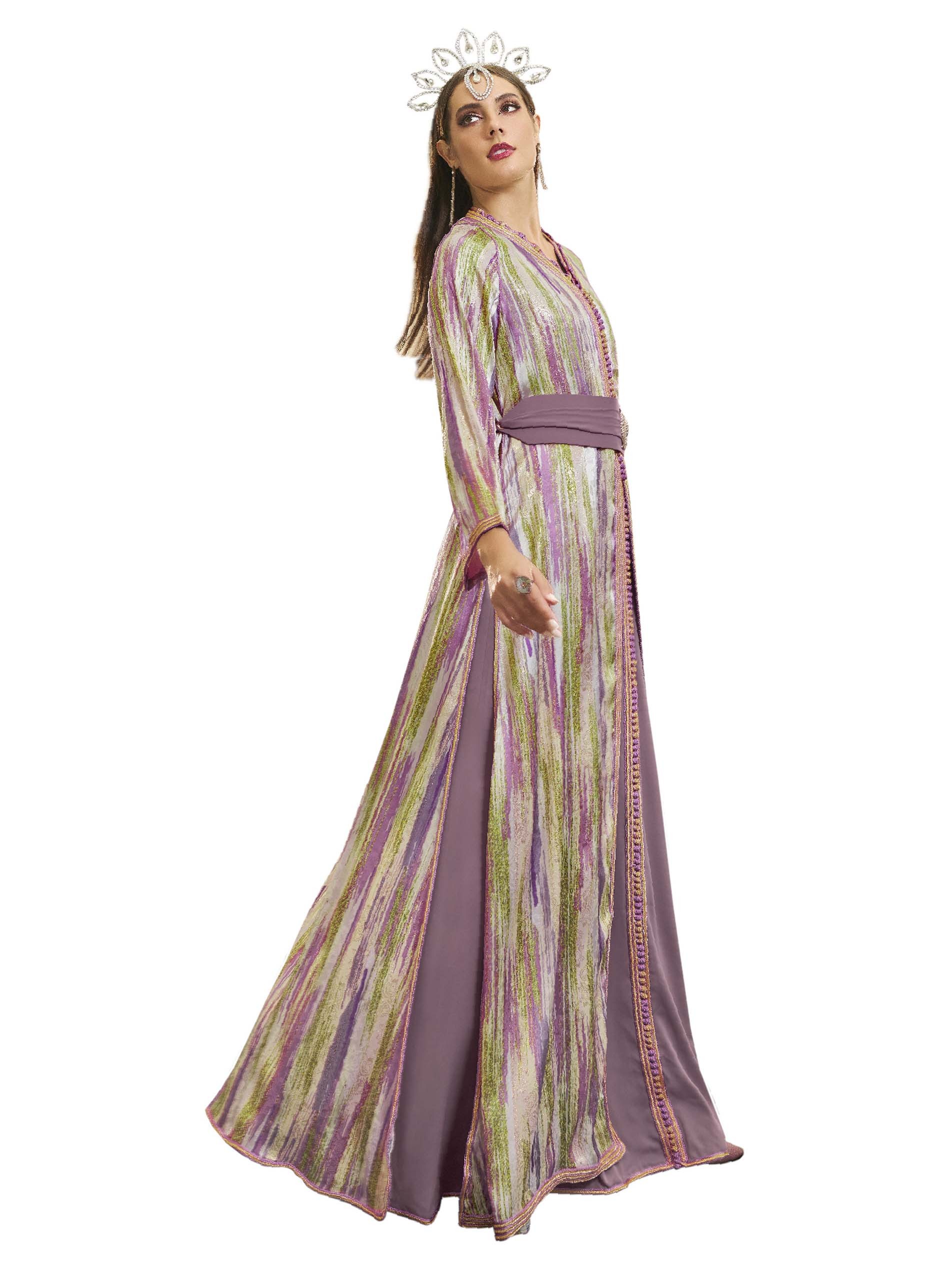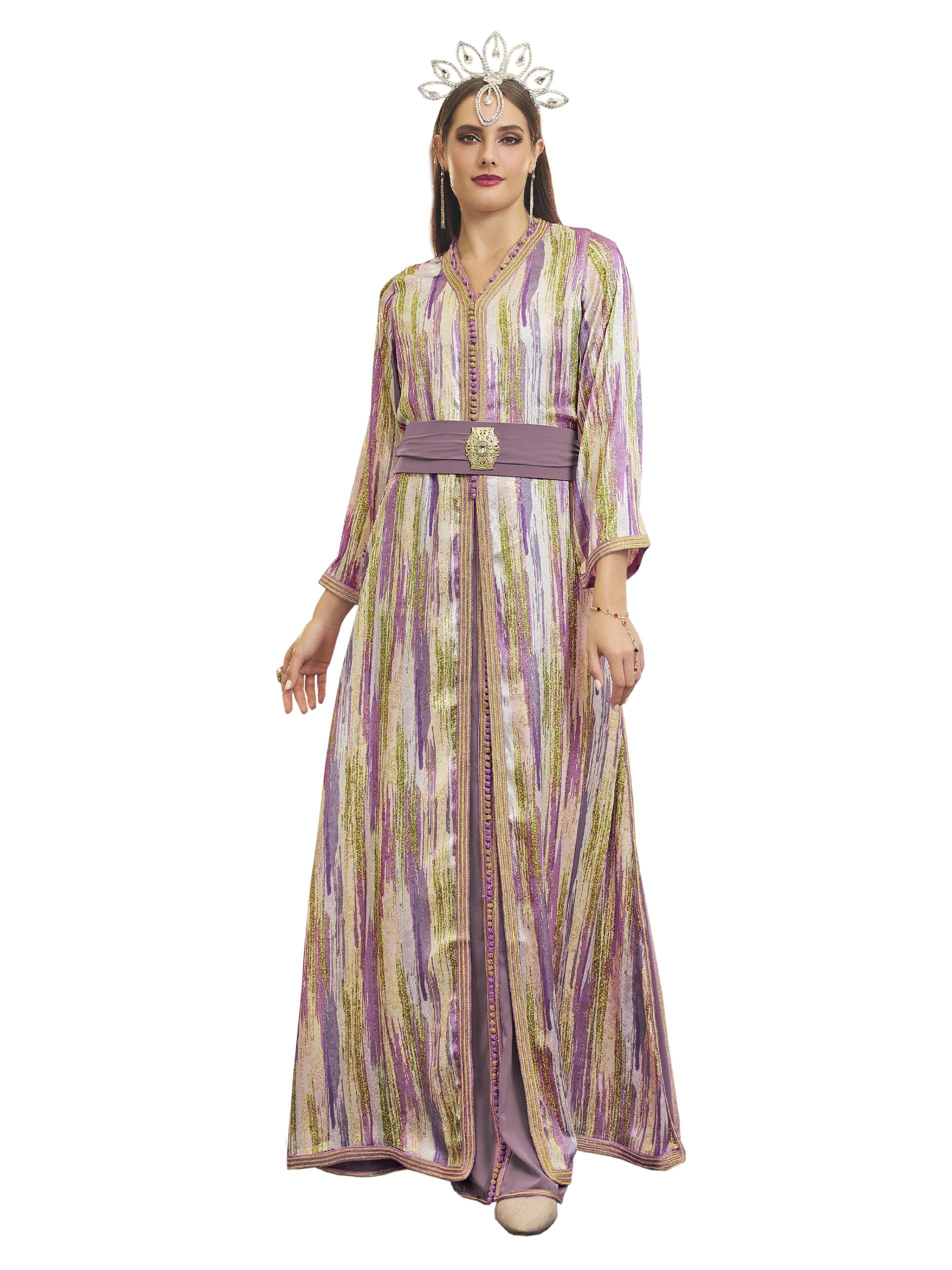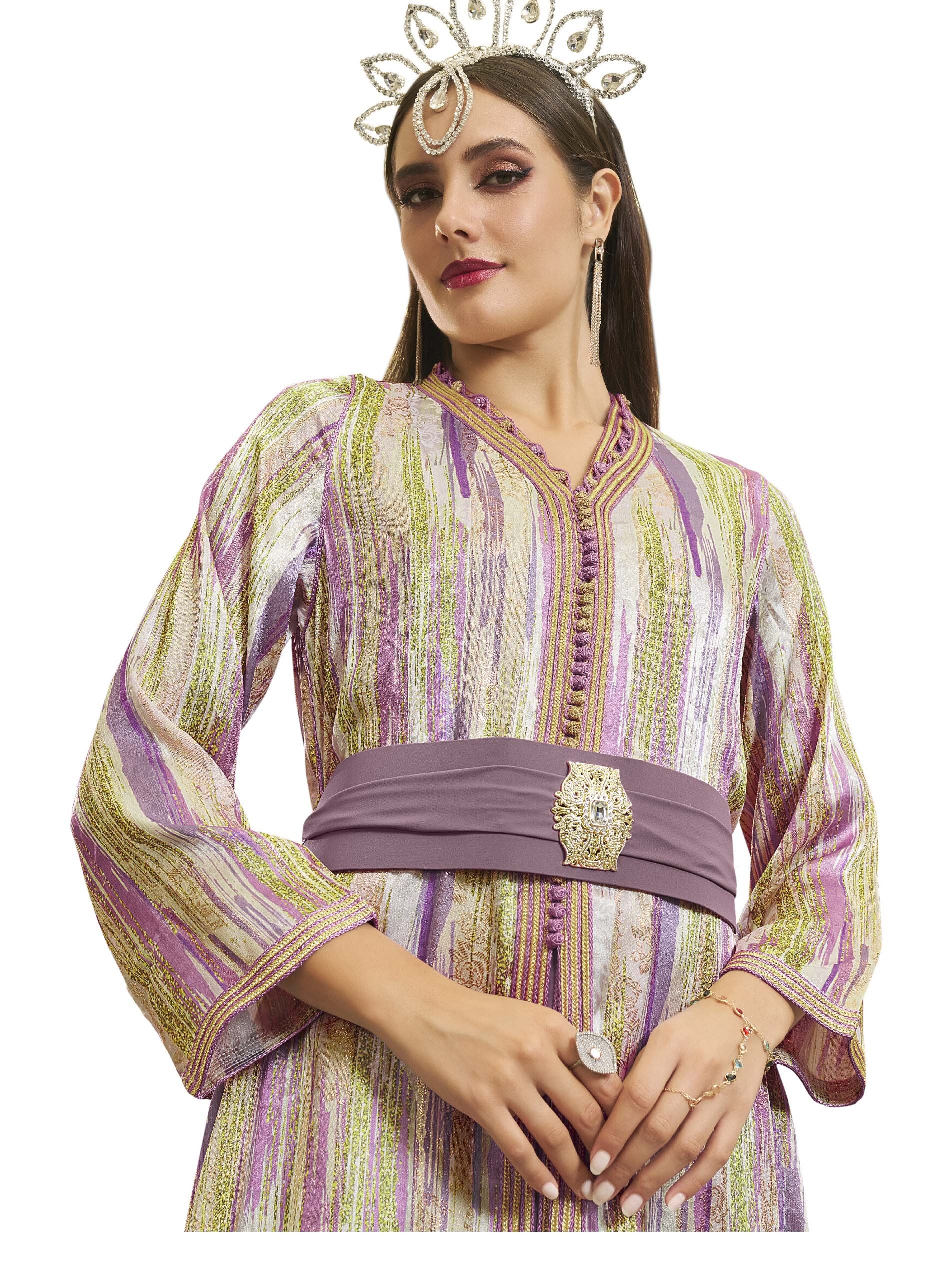 Our long-sleeve cotton jalabiya features distinctive gold and purple patterns, designed with an elegant belt for a stunning ramadan look.