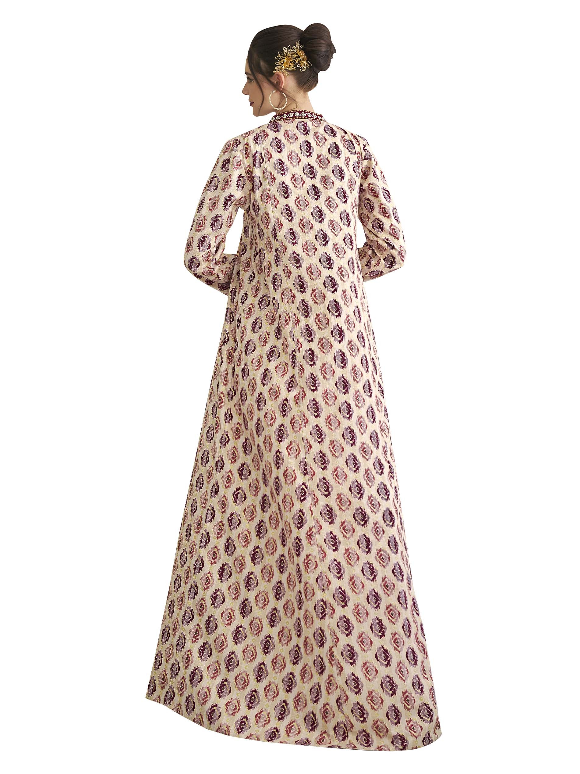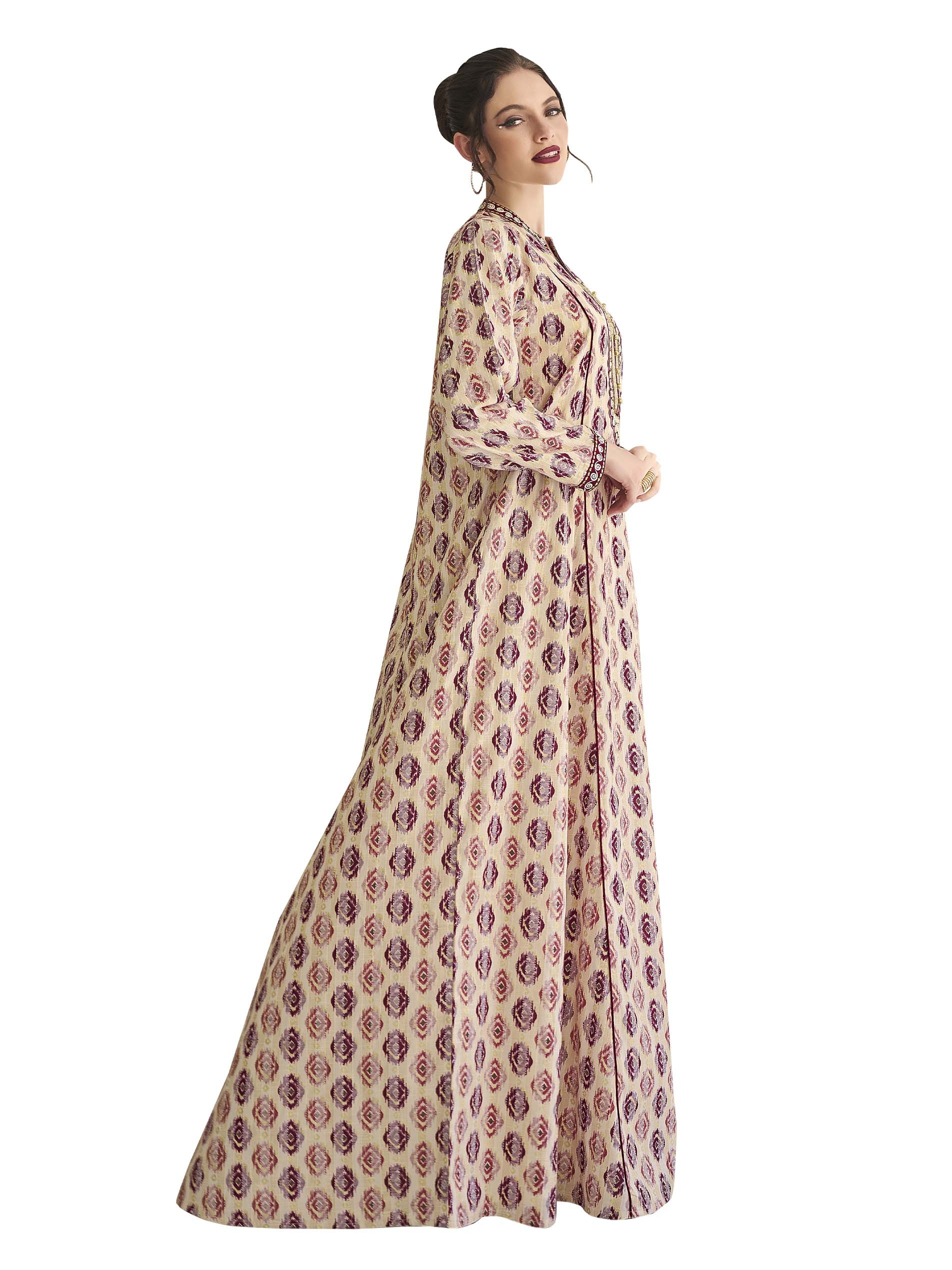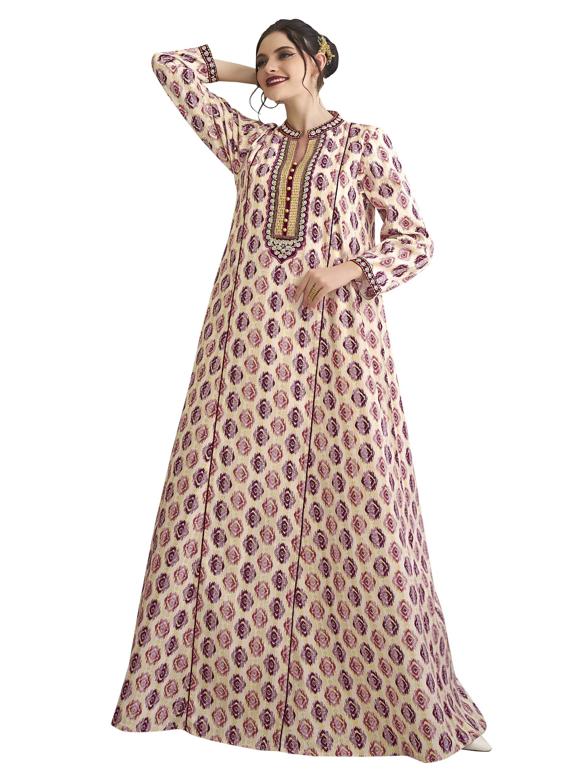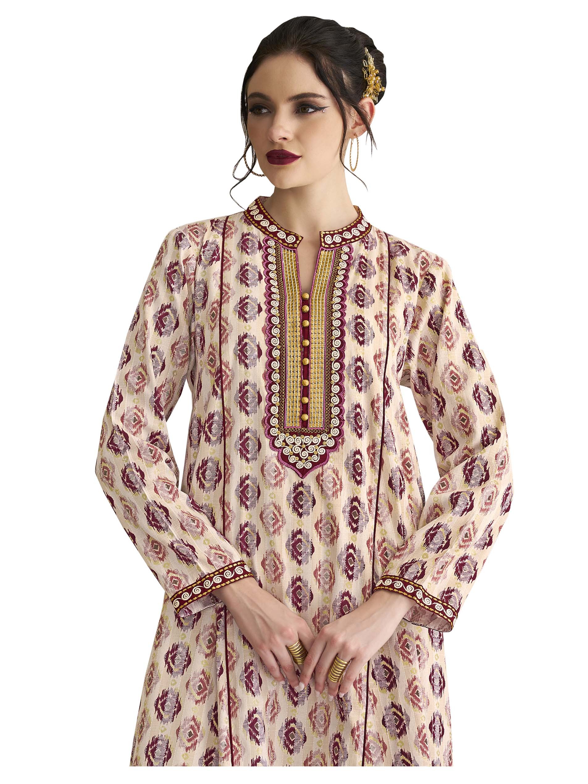 Shine in our cotton jalabiya, designed with a distinctive maroon print, featuring front gold buttons and chest embroidery that comes in white and gold colors.