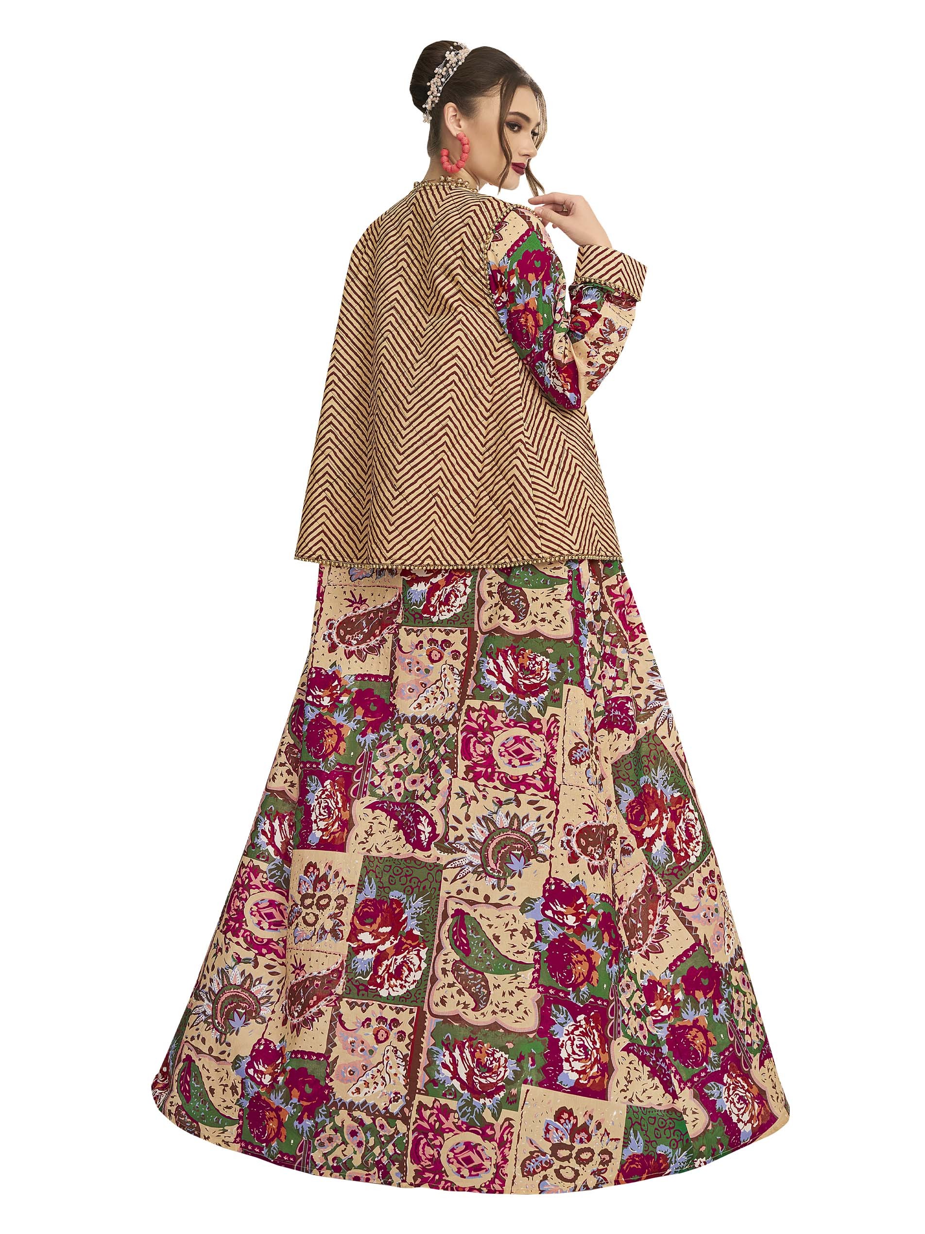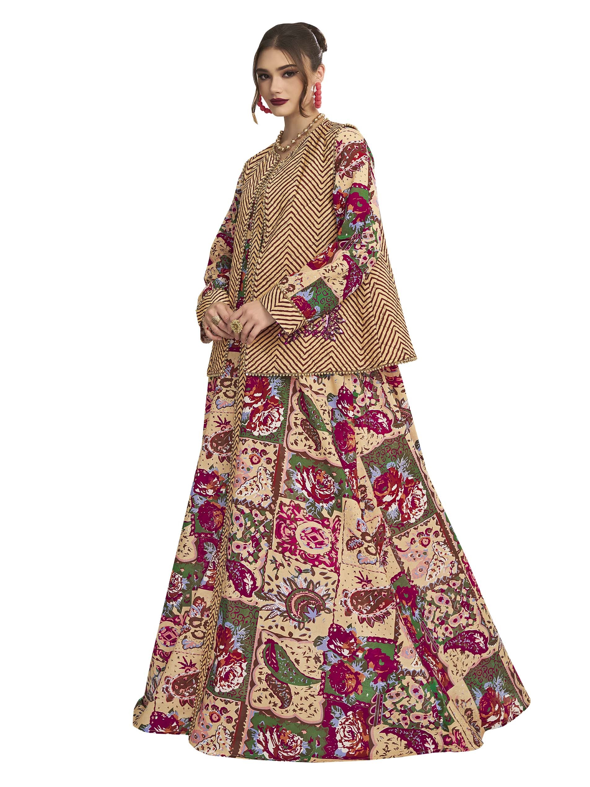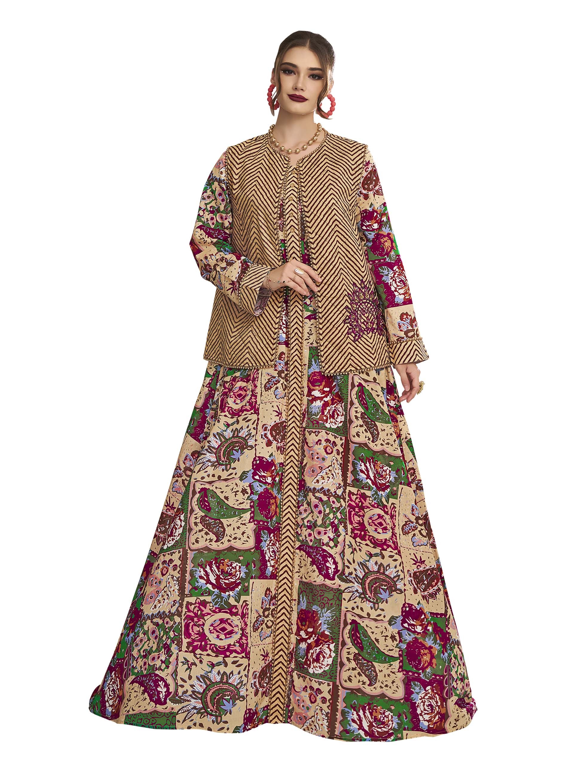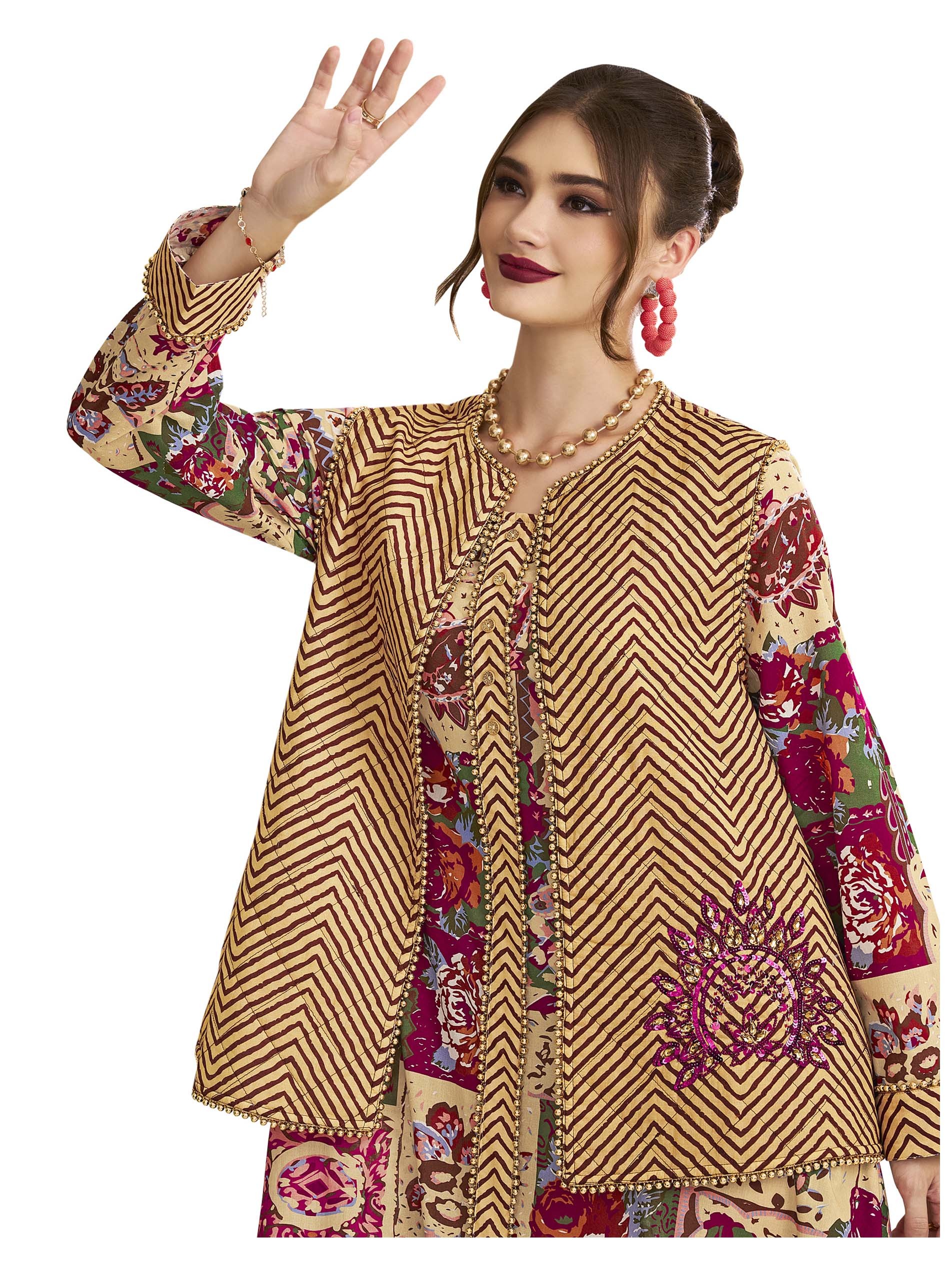 Shine in our gorgeous cotton jalabiya, designed with pink and green patterns, featuring jacket with zigzag print for a unique look.