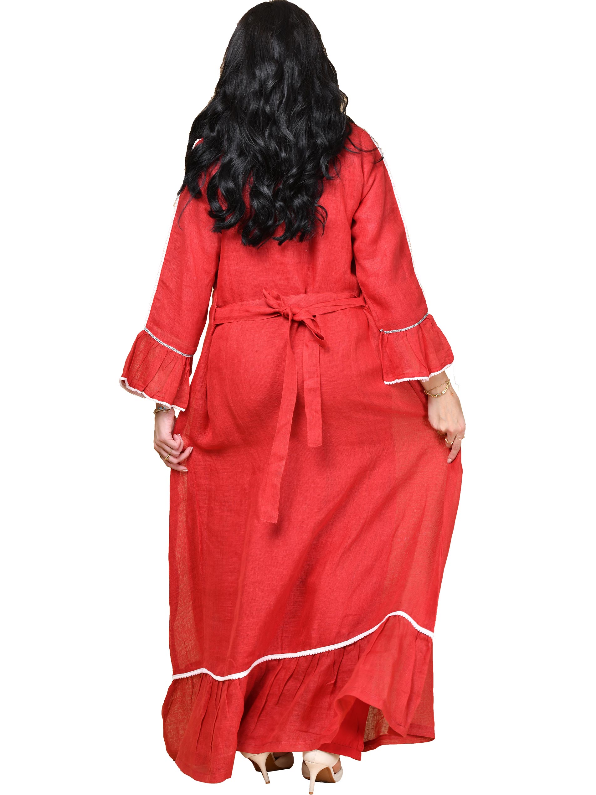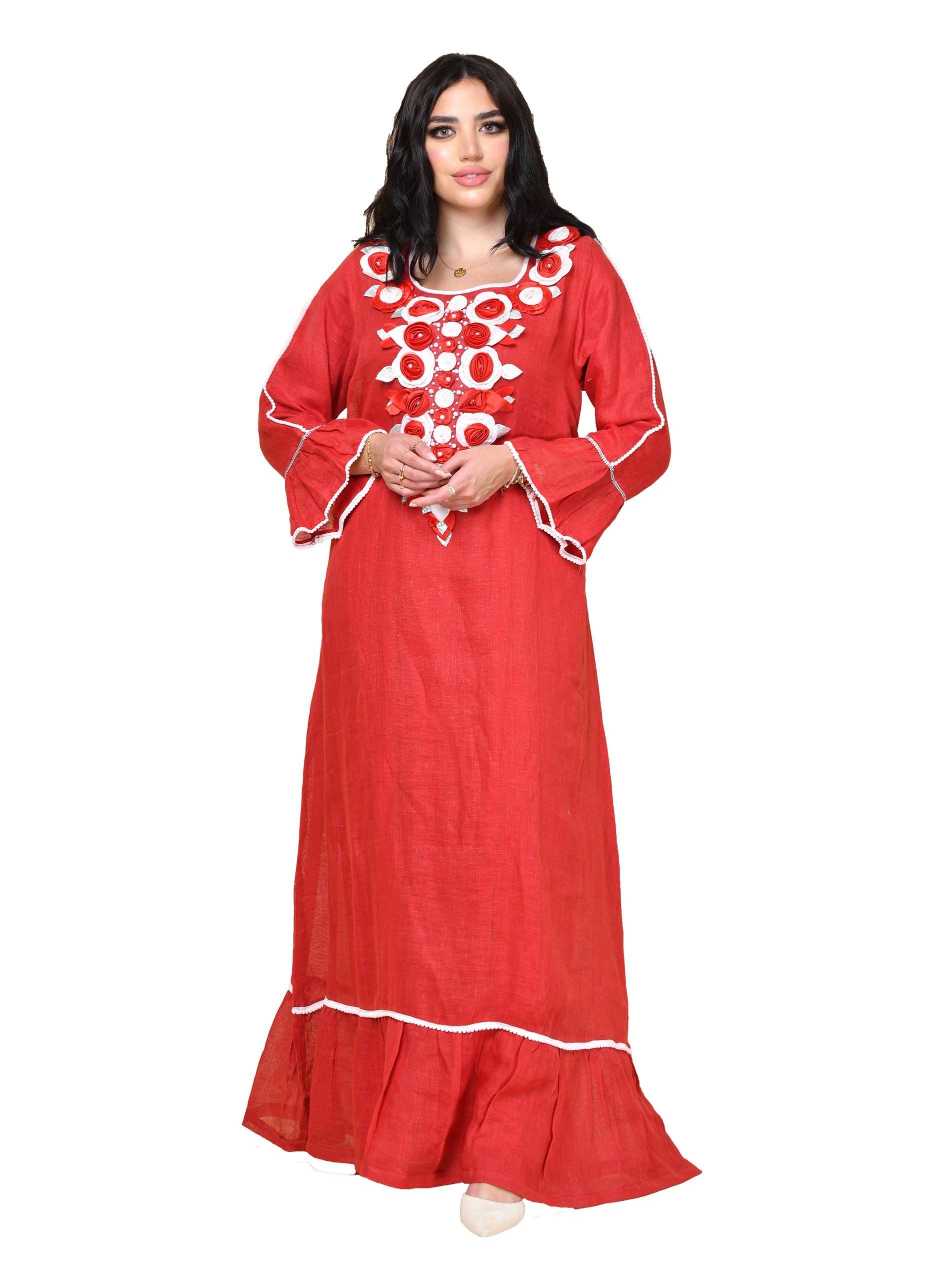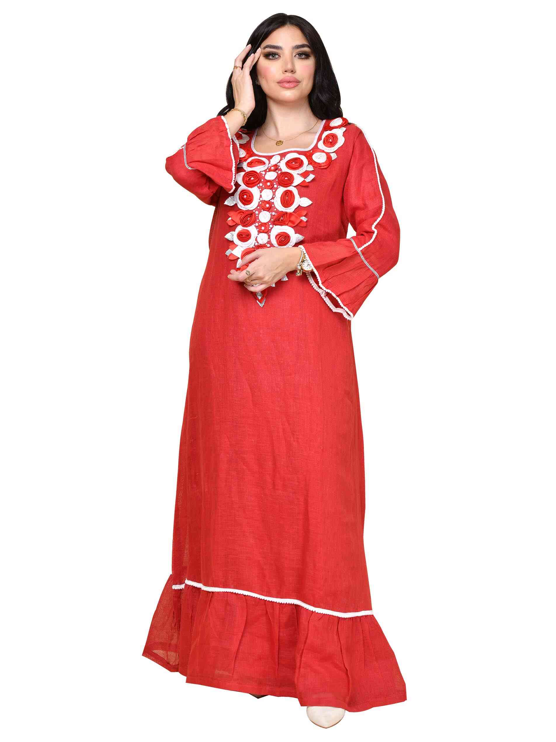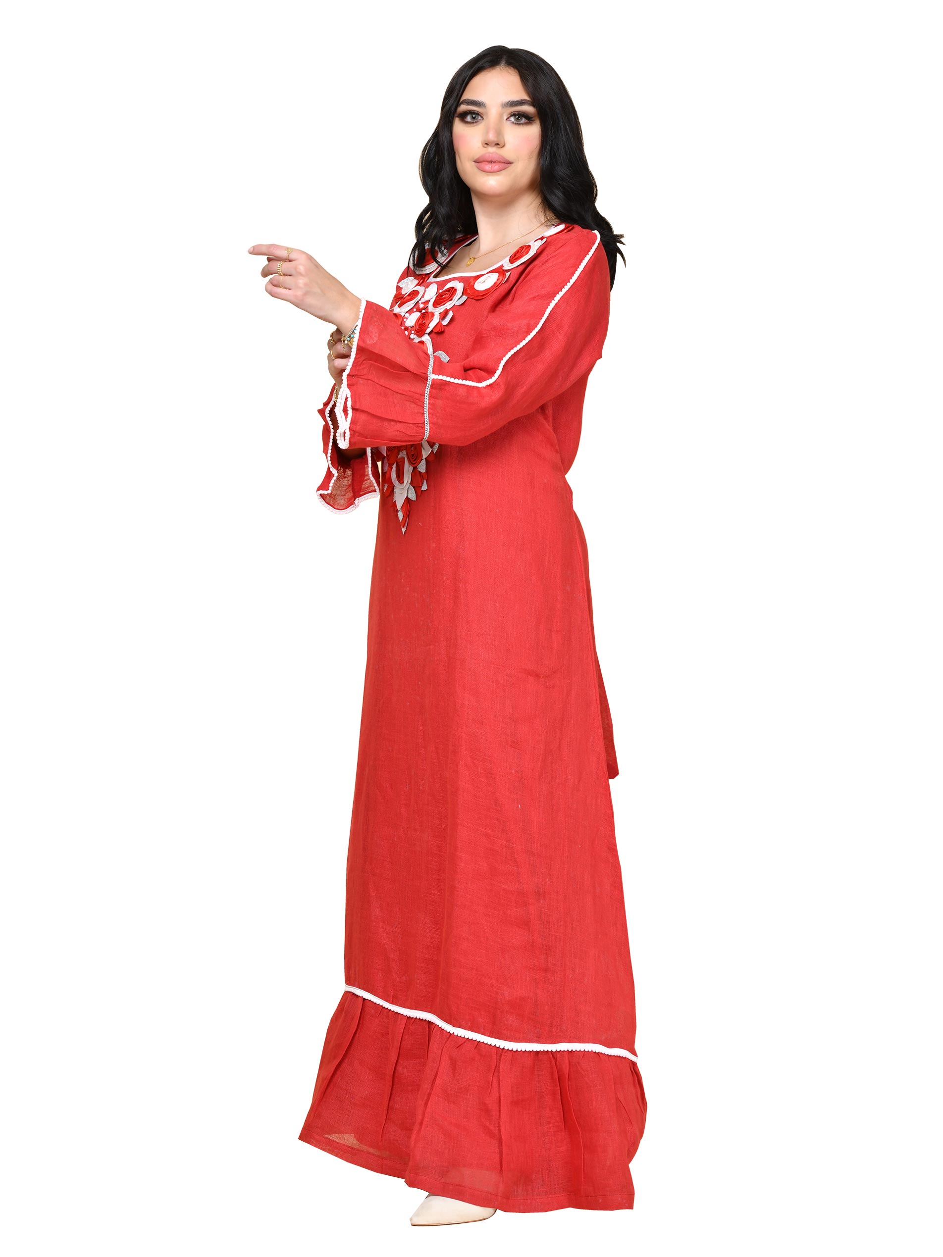 Wear the colour of victory. Look gorgeous in an enchanting red casual full length jalabiya. The exotic red looks even more striking with the cotton embroidery, round neck and fancy sleeves. The rich linen gives the daraat a gracious fall, the A-line cut makes it look chic. The charming flare hemline makes the red beauty irresistible.